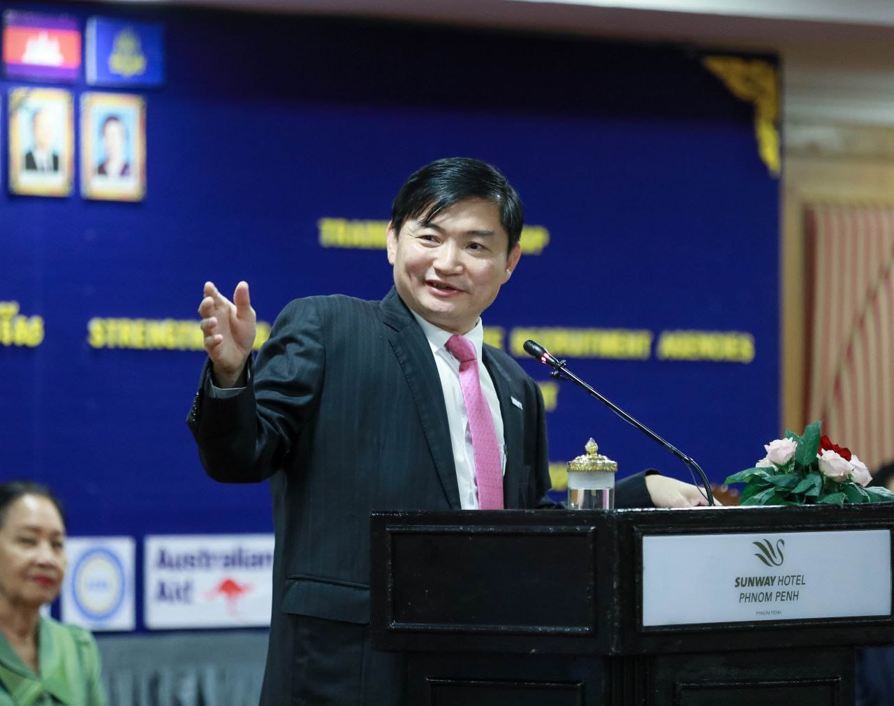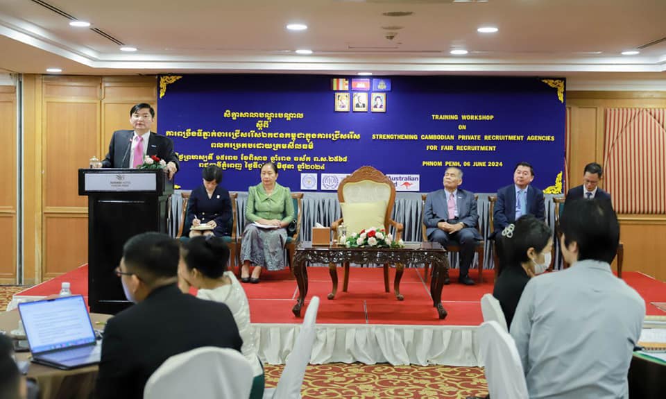 ការថ្លែងនេះ ធ្វើទ្បើងនាឱកាសឯកឧត្តមរដ្ឋមន្ត្រី អញ្ជើញបើកសិក្ខាសាលាបណ្តុះបណ្តាល ស្តីពីការពង្រឹងទីភ្នាក់ងារជ្រើសរើសឯកជនកម្ពុជា ក្នុងការជ្រើសរើសពលករប្រកបដោយក្រមសីលធម៌ ដែលរៀបចំឡើងនៅសណ្ឋាគារសាន់វ៉េ ក្នុងរាជធានីភ្នំពេញកាលពីថ្ងៃទី៦មិថុនា ឆ្នាំ២០២៤។ ឯកឧត្តមរដ្ឋមន្ត្រីគូសបញ្ជាក់ថា រាជរដ្ឋាភិបាលដែលដឹកនាំដោយ សម្តេចមហាបវរធិបតី ហ៊ុន ម៉ាណែត នាយករដ្ឋមន្ត្រីនៃកម្ពុជា តែងគិតគូរដល់ទេសន្តរប្រវេសនករធ្វើចំណាកស្រុក ប្រកបដោយសុវត្ថិភាពទទួលបានកិច្ចគាំពារពីរដ្ឋាភិបាល និងទទួលបានអត្ថប្រយោជន៍ជាអតិបរមា ដើម្បីលើកកម្ពស់ជីវភាពប្រជាពលរដ្ឋឱ្យកាន់តែប្រសើរជាលំដាប់។ ជាមួយគ្នា ឯកឧត្តមរដ្ឋមន្ត្រី ក៏បានជំរុញឱ្យទីភ្នាក់ងារជ្រើសរើសឯកជននៅកម្ពុជា គោរពនូវក្រមសីលធម៌ និងអនុលោមភាពបន្ថែមទៀត ដែលរាជរដ្ឋាភិបាលបានដាក់ចេញ ដើម្បីឱ្យការជ្រើសរើសពលករបម្រើការងារនៅក្រៅប្រទេសប្រកបដោយប្រសិទ្ធភាព និងស័ក្តិសិទ្ធិភាព។