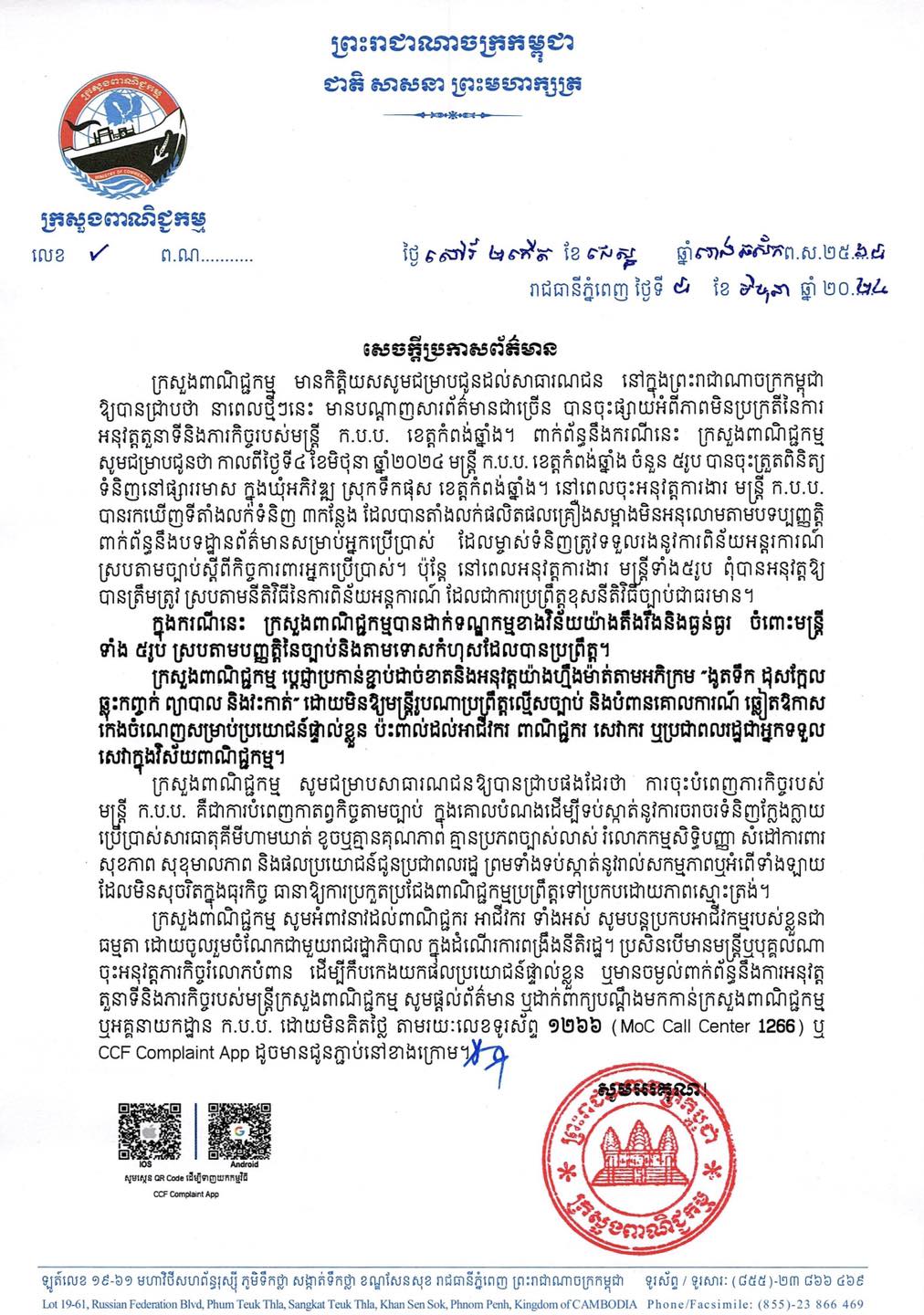 រាជធានីភ្នំពេញ៖ ក្រសួងពាណិជ្ជកម្ម ប្រកាសដាក់ទណ្ឌកម្មខាងវិន័យយ៉ាងតឹងរឹងលើមន្ត្រីនៃ អគ្គនាយកដ្ឋានការពារ អ្នកប្រើប្រាស់ កិច្ចការប្រកួតប្រជែង និងបង្ក្រាបការក្លែងបន្លំ (ក.ប.ប) ចំនួន៥នាក់ ដែលបានប្រព្រឹត្តផ្ទុយពីច្បាប់ប្រមូលលុយពីអាជីវករលក់គ្រឿងក្រអូបនៅផ្សាររមាស ស្រុកទឹកផុស ខេត្តកំពង់ឆ្នាំង។ នេះបើតាមសេចក្តីប្រកាសព័ត៌មានរបស់ក្រសួង ចុះថ្ងៃទី៨មិថុនា ឆ្នាំ២០២៤..។