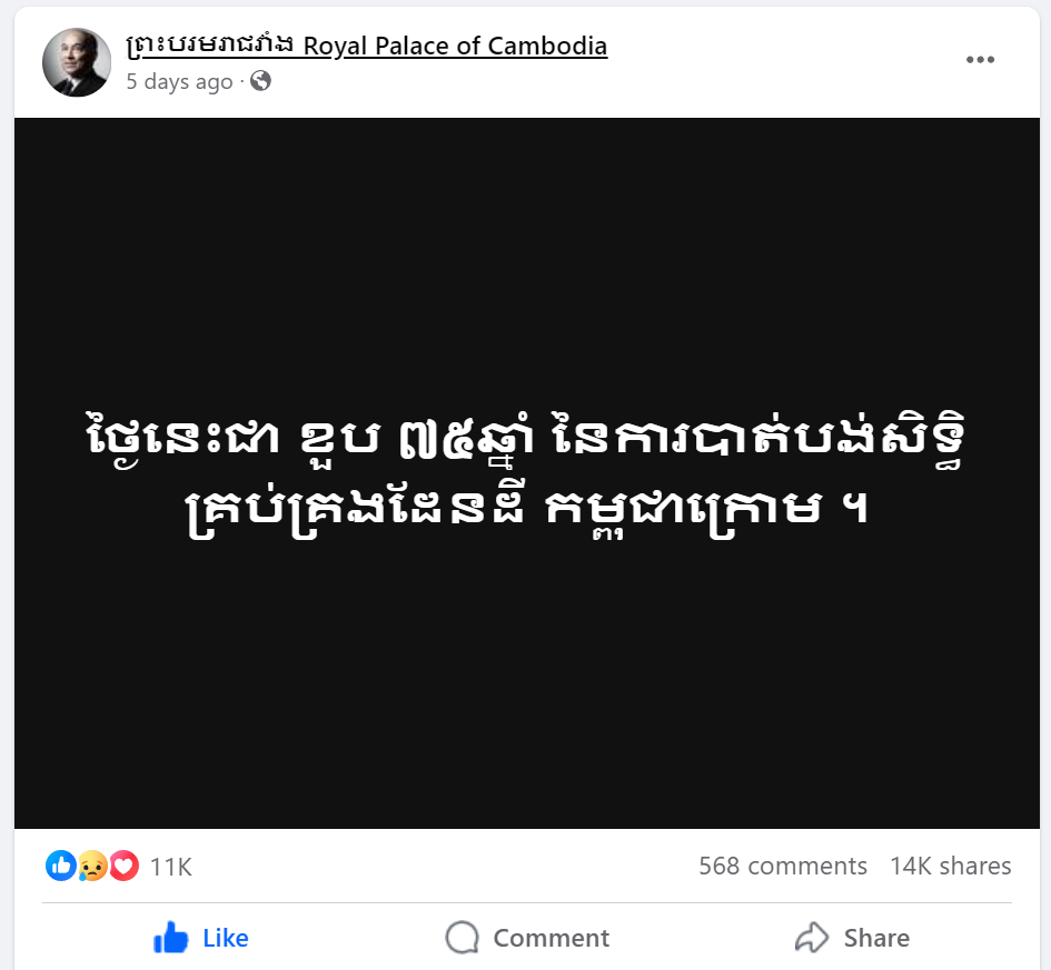 ដោយឡែក កាលពីថ្ងៃទី០៤មិថុនា គណនីហ្វេសប៊ុកដែលមានឈ្មោះ «ព្រះបរមរាជវាំង Royal Palace of Cambodia» មានតាំងព្រះឆាយាល័ក្ខណ៍ ព្រះបាទ សម្តេច ព្រះនរោត្តម សីហមុនី ជារូប Profile ផងនោះ បានបង្ហោះសារយ៉ាងដូច្នេះថា៖ «ថ្ងៃនេះជា ខួប៧៥ឆ្នាំ នៃការបាត់បង់សិទ្ធិគ្រប់គ្រងដែនដី កម្ពុជាក្រោម»។ សារនេះត្រូវបានអ្នកលេងបណ្តាញសង្គមចែកចាយដល់ទៅជាង១ម៉ឺន៤ពាន់ដង និងមានអ្នកចុច Like ដល់ទៅជាង១ម៉ឺន១ពាន់ដង។ សារបែបនេះ ត្រូវបានអ្នកលេងបណ្តាញសង្គមយល់ថា ជាការបង្ហាញព្រះទ័យចូលរួមរំឭក និងព្រះទ័យសោកស្ដាយរបស់អង្គព្រះមហាក្សត្រចំពោះទឹកដីកម្ពុជាក្រោម ដែលកម្រនឹងបានឃើញពីអង្គព្រះមហាក្សត្រ ស្របពេលដែលគេក៏មិនសូវឃើញមន្ត្រីរាជរដ្ឋាភិបាលនិយាយច្រើនប៉ុន្មានដែរ ពីបញ្ហានេះ ពិសេសនៅថ្ងែគម្រប់ខួបតែម្ដង៕