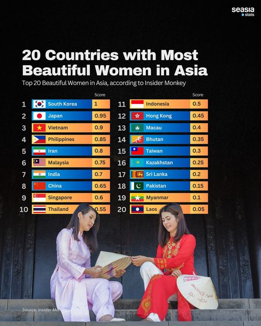 គេហទំព័រ Insider Monkey បានកំណត់ប្រទេសចំនួន២០ ដែលមានស្ត្រីស្រស់ស្អាតបំផុតនៅអាស៊ីដោយប្រទេសកូរ៉េខាងត្បូងកាន់កាប់តំណែងកំពូល បន្ទាប់មកគឺប្រទេសជប៉ុននៅចំណាត់ថ្នាក់លេខ២ និងប្រទេសវៀតណាមជាប់ចំណាត់ថ្នាក់លេខ៣។ ដោយឡែក ប្រទេសអាស៊ីអាគ្នេយ៍ផ្សេងទៀតដែលស្ថិតក្នុងចំណាត់ថ្នាក់កំពូលតារាងទាំង២០នោះរួមមាន៖ ហ្វីលីពីននៅលេខ៤ ម៉ាឡេស៊ីនៅលេខ៦ សិង្ហបុរីនៅលេខ៩ ថៃនៅលេខ១០ ឥណ្ឌូណេស៊ីនៅលេខ១១ មីយ៉ាន់ម៉ាលេខ១៩ និងឡាវនៅលេខ២០។