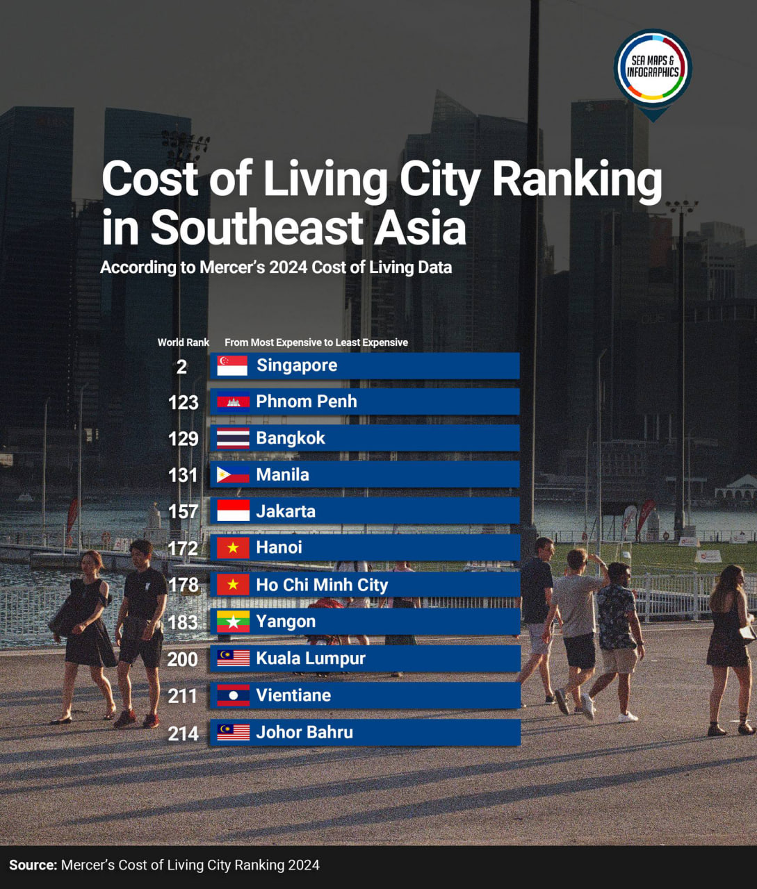 គេហទំព័រ Mercer បានបញ្ចេញរបាយការណ៍មួយបង្ហាញថា សិង្ហបុរី គឺជារដ្ឋបុរី មួយដែលត្រូវចំណាយថ្លៃខ្ពស់ជាងគេសម្រាប់ការរស់នៅ ពោលគឺជាប់លំដាប់ទី១នៅអាស៊ាន និងទី២នៅទូទាំងសកលលោក។ សម្រាប់តំបន់អាស៊ាន រាជធានីភ្នំពេញ ស្ថិតនៅចំណាត់ថ្នាក់ទី២ តាមពីក្រោយដោយរាជធានីបាងកករបស់ប្រទេសថៃ, រដ្ឋធានីម៉ានីលរបស់ប្រទេសហ្វីលីពីន, រដ្ឋធានីហ្សាការតារបស់ឥណ្ឌូណេស៊ី និងរដ្ឋធានីហាណូយ និងទីក្រុងព្រៃនគររបស់ប្រទេសវៀតណាម។ ទីក្រុងយ៉ាំងហ្គោនរបស់មីយ៉ាន់ម៉ា, រដ្ឋធានីគូឡាឡាំពួររបស់ប្រទេសម៉ាឡេស៊ី, រដ្ឋធានីវៀងចន្ទន៍របស់ប្រទេសឡាវ និងចុងក្រោយទីក្រុងចូហូ បារូ របស់ប្រទេសម៉ាឡេស៊ី។