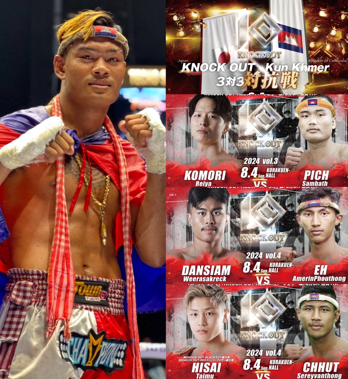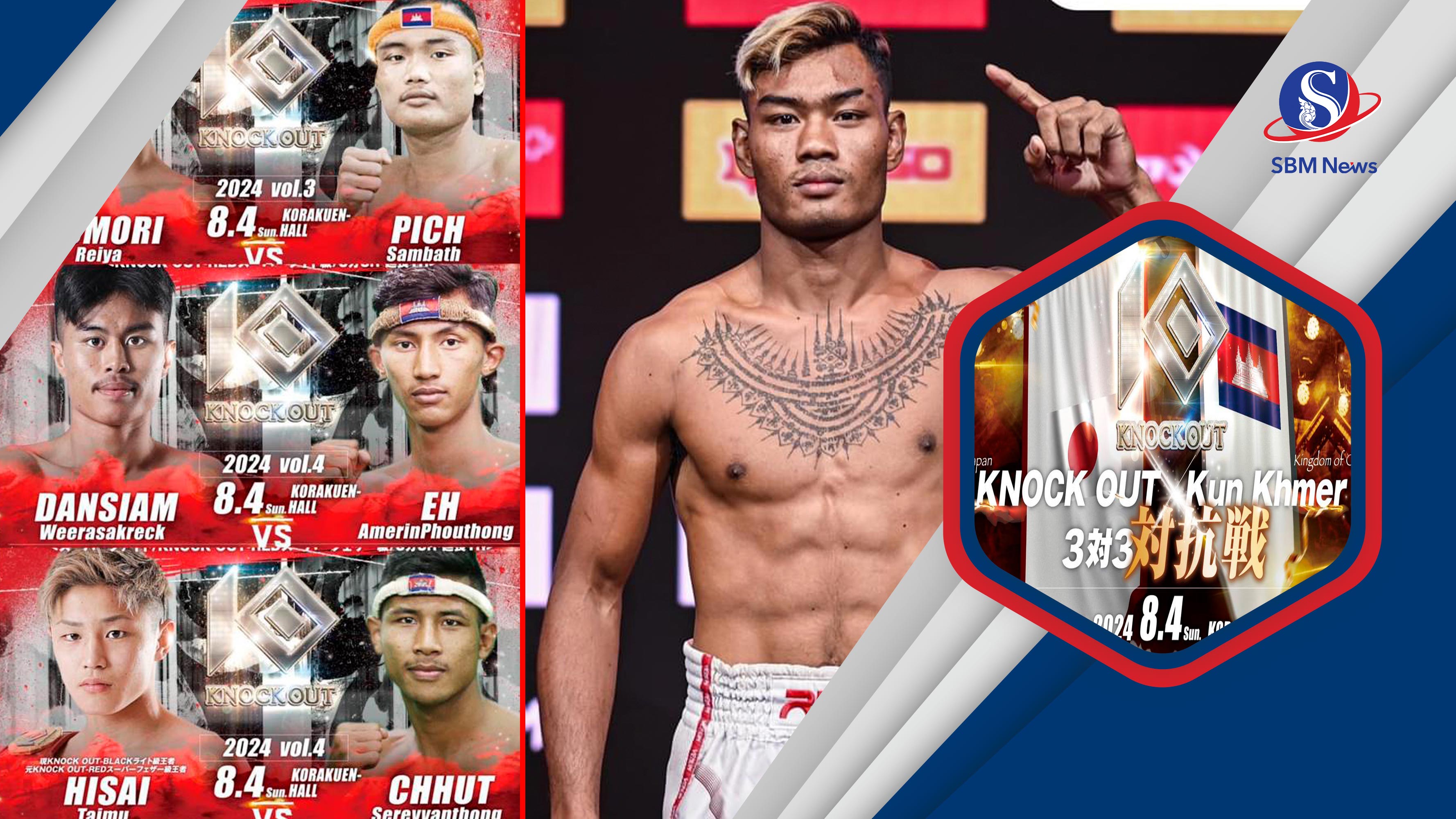 យ៉ាងណា ព្រឹត្តិការណ៍ Kock Out X Kun Khmer នៅថ្ងៃទី០៤សីហាខាងមុខ កីឡាករកម្ពុជាលំដាប់ប្រទេសចំនួន៤រូប នឹងត្រូវចេញទៅប្រកួតជាមួយជើងខ្លាំងម្ចាស់ផ្ទះជប៉ុនរួមមាន៖ រាហ៊ូមាស ឈុតសេរីវាន់ថង និងត្រូវជួបប្រកួតជាមួយដៃគូចាស់ ពេជ្រ សម្បត្តិ គឺ កីឡាករជប៉ុន តៃម៉ូ ហ៊ីសៃ ចំណែកដៃគូចាស់ តៃម៉ូ ហ៊ីសៃ ក្របីព្រៃ ពេជ្រ សម្បត្តិ នឹងត្រូវជួបជាមួយកីឡាករ កូម៉ូរិ រីយ៉ា និងទាយាទស្ដេចប្រដាល់ត្រកូលអេ កីឡាករ អេអាំម៉ារីន ភូថង នឹងត្រូវជួបជាមួយកីឡាករជប៉ុន-ថៃ ដែនស្យាម វីរៈស័ករិក និងចុងក្រោយអ្នកលេងពូថៅថៅដៃពិឃាត ធឿន ធារ៉ា ត្រូវជួបជើងខ្លាំងប្រចាំប្រទេសជប៉ុន ប៉ុន្តែនៅមិនទាន់បានបង្ហាញមុខដៃគូនៅឡើយទេ។