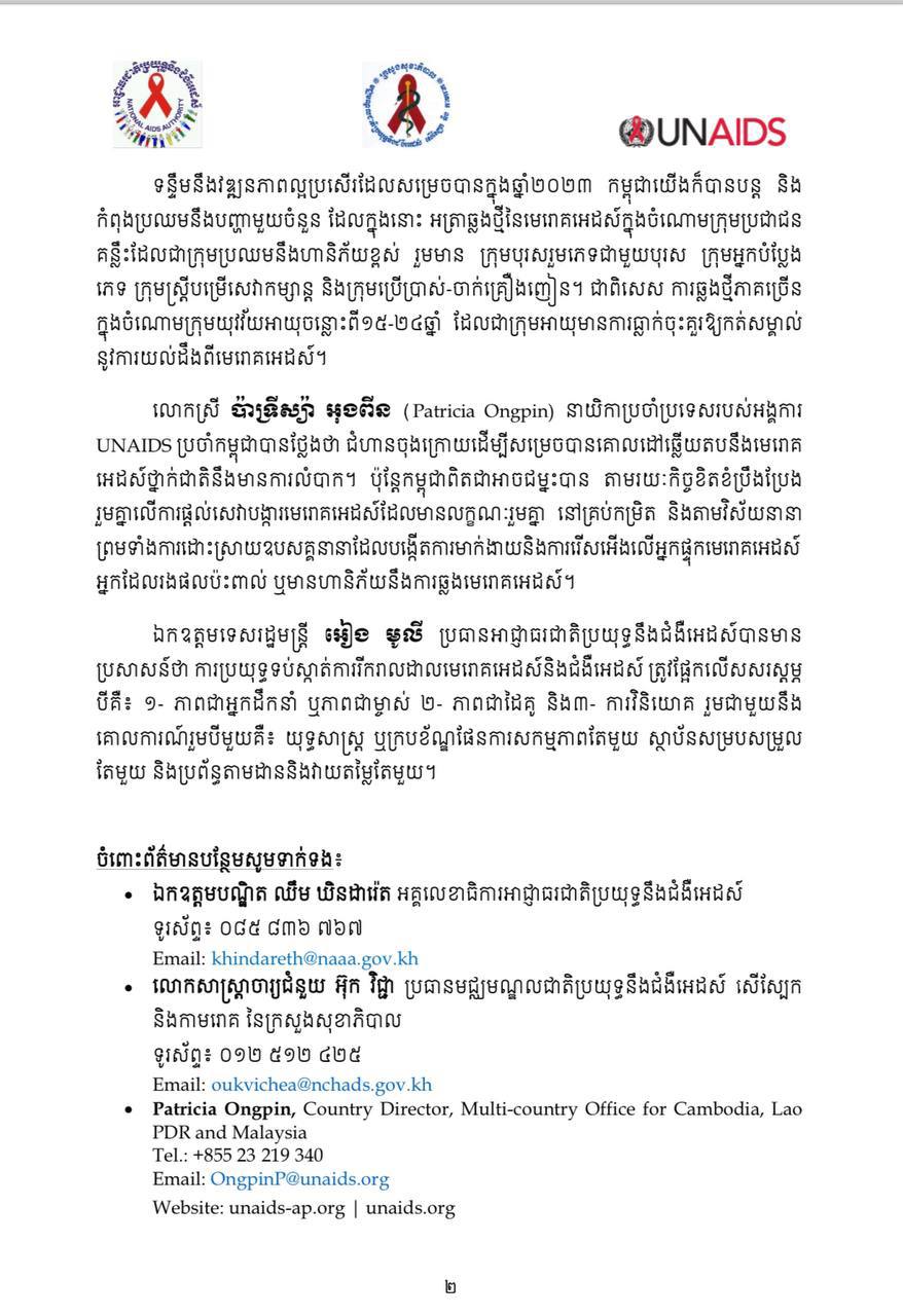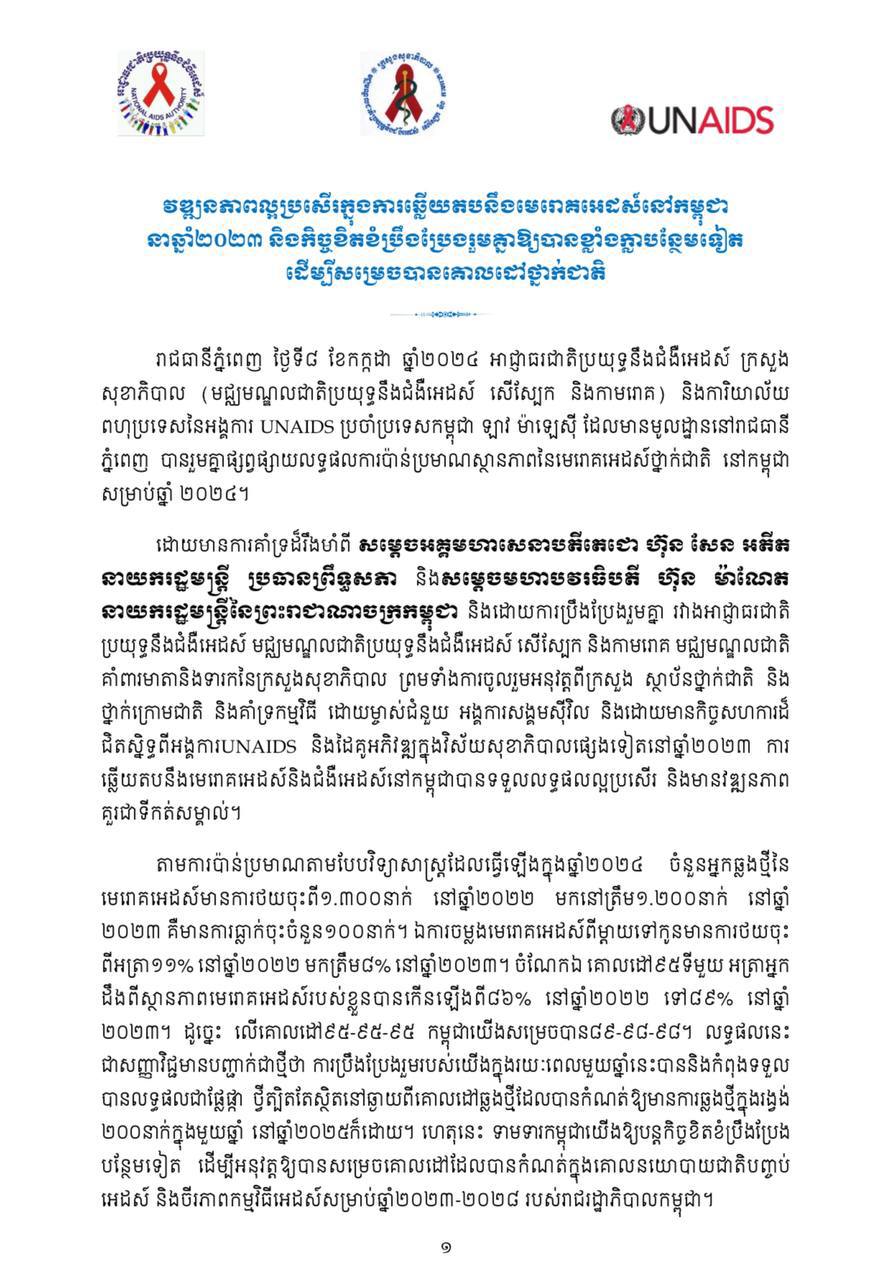 បើតាមសេចក្តីប្រកាសអន្តរស្ថាប័នខាងលើបង្ហាញថា ការឆ្លើយតបនឹងមេរោគអេដស៍ និងជំងឺអេដស៍នៅកម្ពុជា នៅឆ្នាំ២០២៣ ទទួលលទ្ធផលល្អប្រសើរ និងមានវឌ្ឍនភាពគួរជាទីកត់សម្គាល់។ តាមការប៉ាន់ប្រមាណតាមបែបវិទ្យាសាស្រ្ត ធ្វើឡើងក្នុងឆ្នាំ២០២៤ ចំនួនអ្នកឆ្លងថ្មីនៃមេរោគអេដស៍មានការថយចុះពី១៣០០នាក់ នៅឆ្នាំ២០២២ មកនៅត្រឹម១២០០នាក់នៅឆ្នាំ២០២៣ ពោលគឺមានការធ្លាក់ចុះចំនួន១០០នាក់។ ឯការចម្លងមេរោគអេដស៍ពីម្តាយទៅកូនមានការថយចុះពីអត្រា១១ភាគរយ នៅឆ្នាំ២០២២ មកត្រឹម៨ភាគរយ នៅឆ្នាំ២០២៣។ ចំណែកឯគោលដៅ៩៥ ទី១.អត្រាអ្នកដឹងពីស្ថានភាពមេរោគអេដស៍របស់ខ្លួនបានកើនឡើងពី៨៦ភាគរយ នៅឆ្នាំ២០២២ ទៅ៨៩ភាគរយ នៅឆ្នាំ២០២៣ ដូច្នេះលើគោលដៅ៩៥-៩៥-៩៥ កម្ពុជាយើងសម្រេចបាន៨៩-៩៨-៩៨។