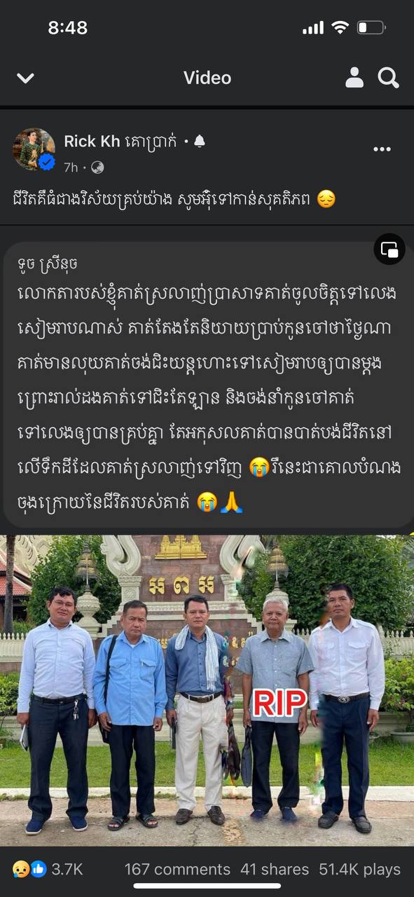 ជាមួយគ្នានេះ ស្រីនុចក៏សរសេរសំណេរក្នុងចិត្តមួយលើបណ្ដាញសង្គមហ្វេសប៊ុក ដោយមានខ្លឹមសារថា៖ «លោកតារបស់ខ្ញុំគាត់ស្រឡាញ់ប្រាសាទគាត់ចូលចិត្តទៅលេងសៀមរាបណាស់ គាត់តែងតែនិយាយប្រាប់កូនចៅថាថ្ងៃណាគាត់មានលុយគាត់ចង់ជិះយន្តហោះទៅសៀមរាបឱ្យបានម្ដងព្រោះរាល់ដងគាត់ទៅជិះតែឡាន និងចង់នាំកូនចៅគាត់ទៅលេងឱ្យបានគ្រប់គ្នា តែអកុសលគាត់បានបាត់បង់ជីវិតនៅ លើទឹកដីដែលគាត់ស្រឡាញ់ទៅវិញ ( រឺនេះជាគោលបំណងចុងក្រោយនៃជីវិតរបស់គាត់»។