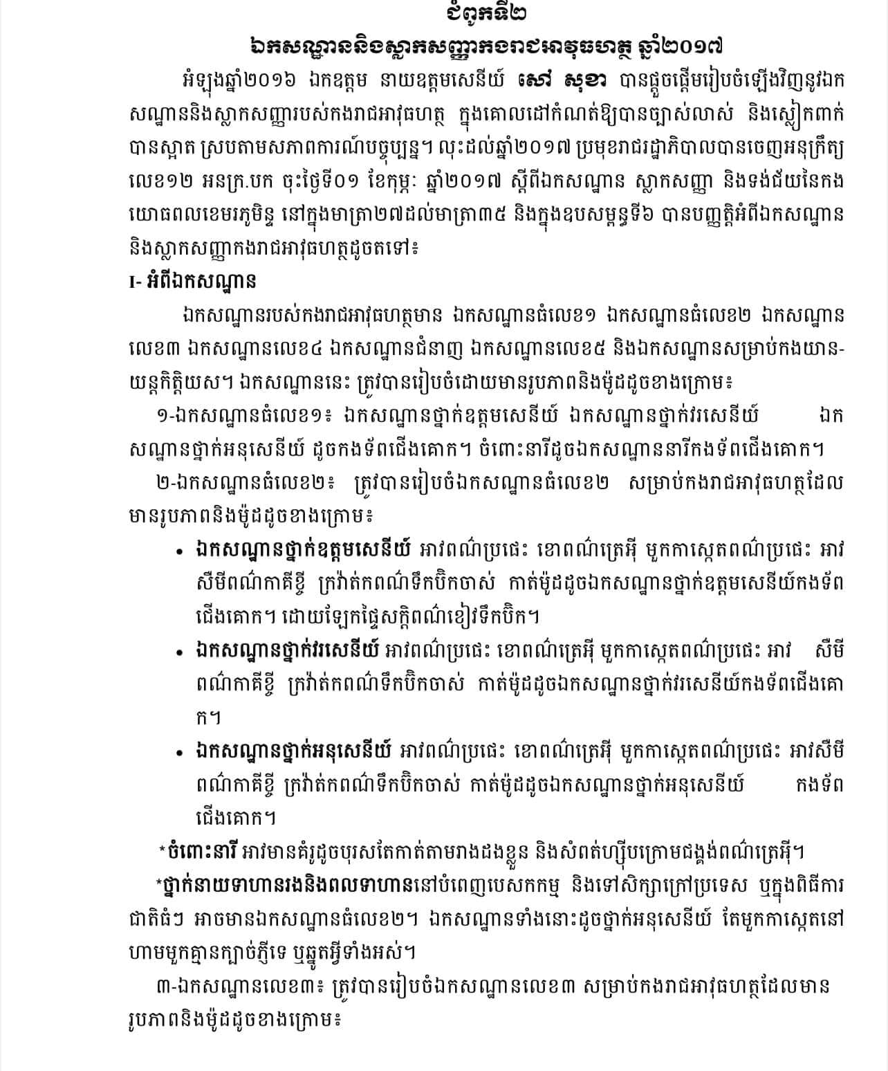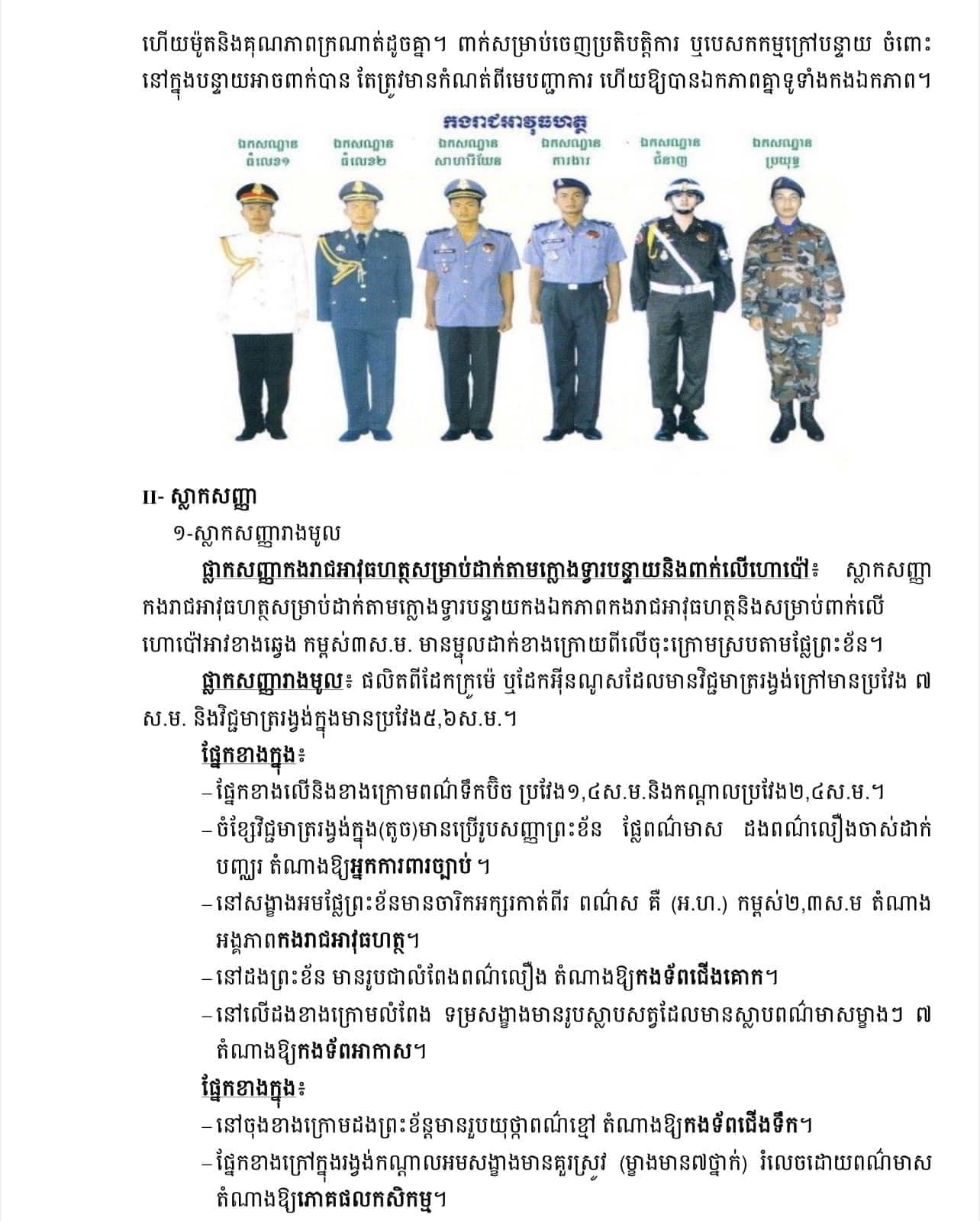 និងទី៣.អំពើប្រើប្រាស់ជាសាធារណៈ ដោយគ្មានសិទ្ធិនូវលម្លៀកបំពាក់ ឯកសណ្ឋាន អត្តសញ្ញាណបណ្ណ សញ្ញាសម្គាល់ ឬយានយន្តនគរបាល ឬយោធា មានភាពប្រហាក់ប្រហែលគ្នានឹងសម្លៀកបំពាក់ ឯកសណ្ឋាន អត្តសញ្ញាណបណ្ណ សញ្ញាសម្គាល់ ឬយានយន្តនគរបាល ឬយោធា ដែលអាចនាំឱ្យមានការភាន់ច្រឡំក្នុងស្មារតីនៃសាធារណជន ត្រូវផ្តន្ទាទោសដាក់ពន្ធនាគារពី១ខែ ទៅ៦ខែ និងពិន័យជាប្រាក់ពីមួយសែនរៀលទៅមួយលានរៀល ដូចមានចែងក្នុងមាត្រា៦១៦ បទប្រើប្រាស់នូវឯកសណ្ឋានជាអាទិ៍ ដែលមានភាពប្រហាក់ប្រហែលគ្នានឹងនគរបាល ឬយោធា៕