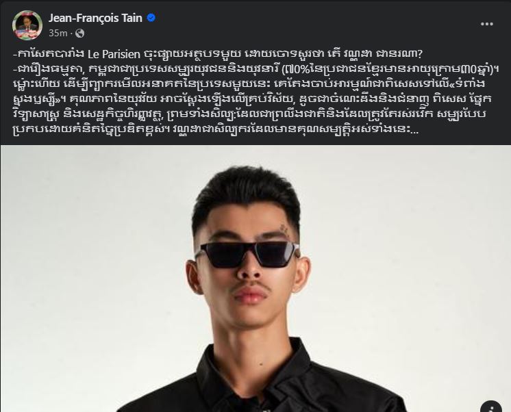 រាជធានីភ្នំពេញ៖ អ្នកគាំទ្របង្ហាញការចាប់អារម្មណ៍និងចាត់ទុកថានេះជាមោទនភាពជាតិខ្មែរ ក្រោយឃើញវត្តមានកំពូលតារាចម្រៀង Rap របស់ប្រទេសកម្ពុជា លោក វណ្ណដា( Vann Da) បង្ហាញខ្លួនលើឆាក នៃកម្មវិធីបិទការប្រកួតកីឡាអូឡាំពិករដូវក្ដៅ ក្រុងប៉ារីស ប្រទេសបារាំង ឆ្នាំ២០២៤ រំលេចនៅឈុតច្នៃពីហូលខ្មែរ។