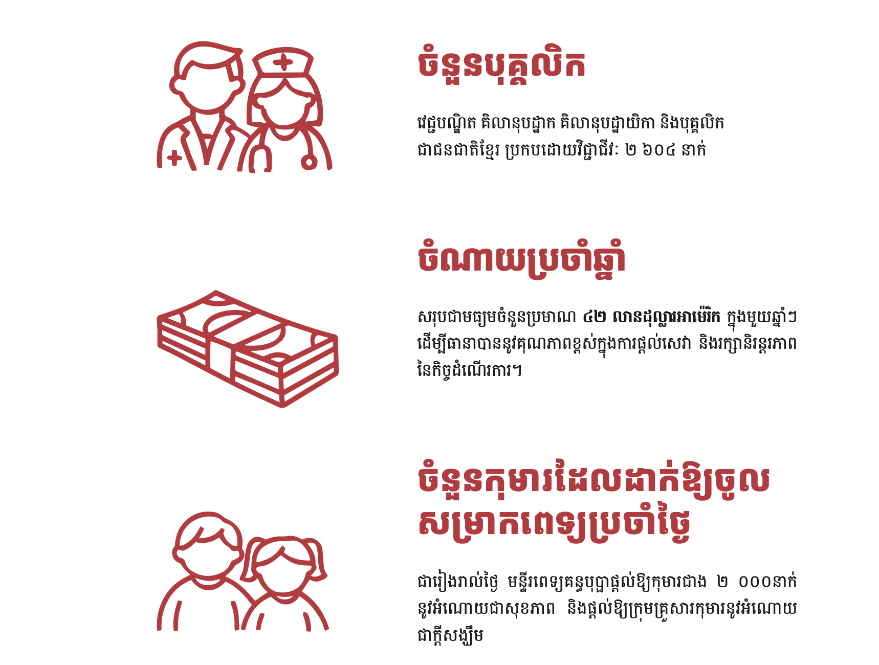រាជធានីភ្នំពេញ៖ បច្ចុប្បន្ន មន្ទីរពេទ្យគន្ធបុប្ផាទាំងនៅក្នុងរាជធានីភ្នំពេញ និងខេត្តសៀមរាប ត្រូវការថវិកាចំណាយប្រចាំឆ្នាំជាមធ្យមចំនួនប្រមាណ៤២លានដុល្លារ សម្រាប់បន្តបេសកកម្មពិនិត្យ និងព្យាបាលជំងឺទារក និងកុមារនៅកម្ពុជា ដោយឥតគិតថ្លៃ និងរក្សាបាននូវកម្រិតគុណភាពមួយដែលមានការទទួលស្គាល់ពីសាធារណជន។ នេះបើតាមរបាយការណ៍ប្រចាំឆ្នាំ២០២៣របស់មូលនិធិគន្ធបុប្ផាកម្ពុជា។