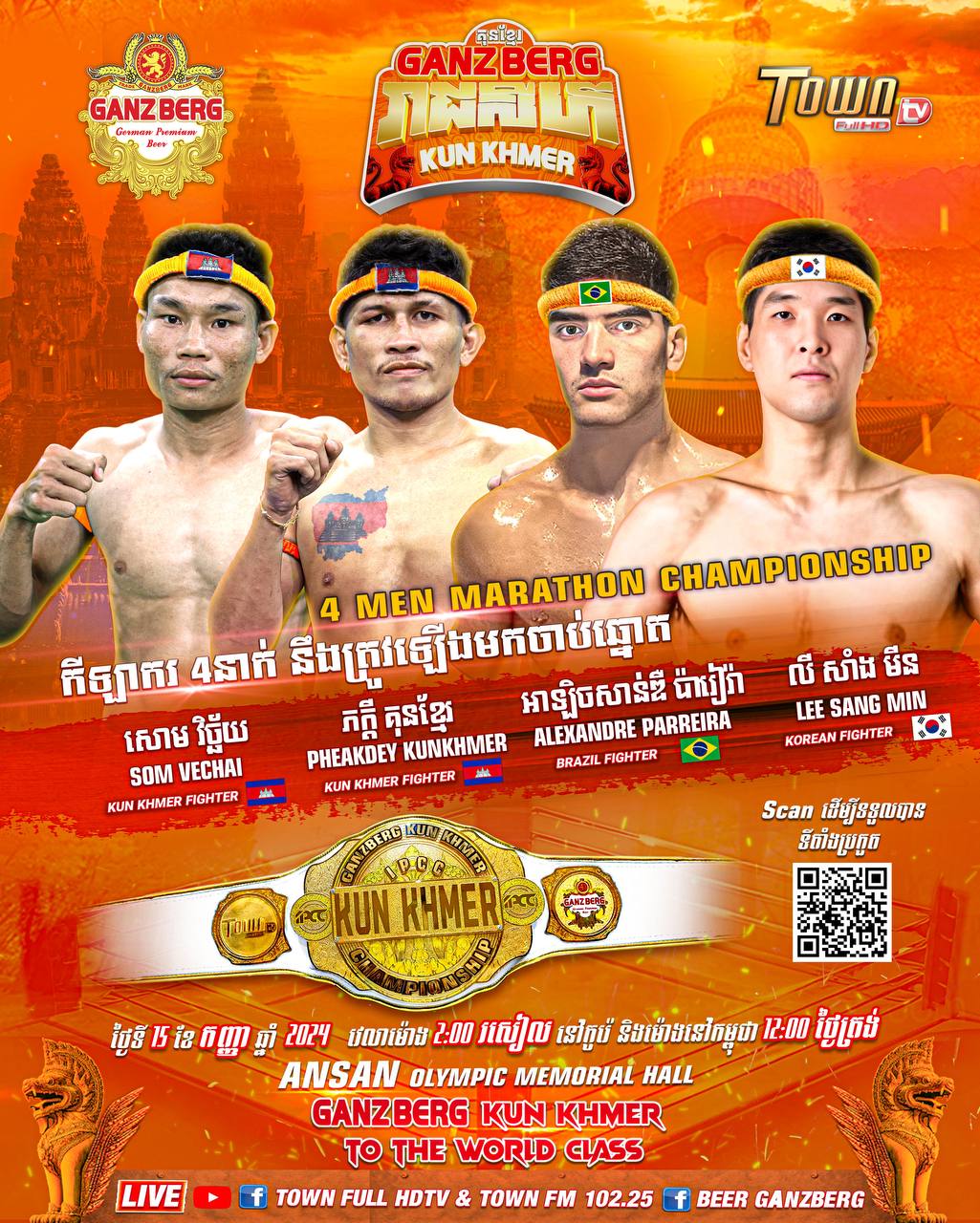 កីឡាករជួរមុខកម្ពុជា៦រូប បានត្រៀមខ្លួនរួចជាស្រេចក្នុងការបង្ហាញក្បាច់គុនខ្មែរនៅលើទឹកដីអាស៊ីខាងកើត ក្នុងនោះកីឡាករម្ចាស់ផ្ទះ និងកីឡាករបរទេស៣រូបផ្សេងទៀត ក៏នឹងចូលរួមក្នុងព្រឹត្តិការណ៍ដ៏ធំជាប្រវត្តិសាស្ត្រមួយនេះដែរ។ កីឡាករ សោម វិឆ្ឆ័យ និងមិត្តរួមជាតិ ភក្ដី គុនខ្មែរ នឹងត្រូវប្រកួតម៉ារ៉ាតុនដណ្ដើម ខ្សែក្រវាត់មាស IPCC KUN KHMER Championship ដែលមានការចូលរួមពីកីឡាករម្ចាស់ផ្ទះ និងជាម្ចាស់ក្បាច់គុនតៃក្វាន់ដូ និងកីឡាករប្រេស៊ីល ដោយការប្រកួតវិលជុំចាញ់ធ្លាក់ ឈ្នះឡើងទៅដណ្តើមខ្សែក្រវាត់។ ចំណែក ទាយាទស្ដេចប្រដាល់ត្រកូលអេ ទាំងពីររូប គឺ កីឡាករ ម៉ឺន មេឃា និងប្អូនប្រុស អេអាំម៉ារីន ភូថង នឹងត្រូវប្រកួតមិត្តភាពជាមួយម្ចាស់ផ្ទះកូរ៉េ និងអូស្ត្រាលី ខណៈ ឡុង អាឆើត ដែលទើបនឹងឡើងជើងខ្លាំងនៅមួយរយៈចុងក្រោយនេះ ត្រូវជួបកីឡាករម្ចាស់ផ្ទះ ជែរហូ គីម ផងដែរ។
