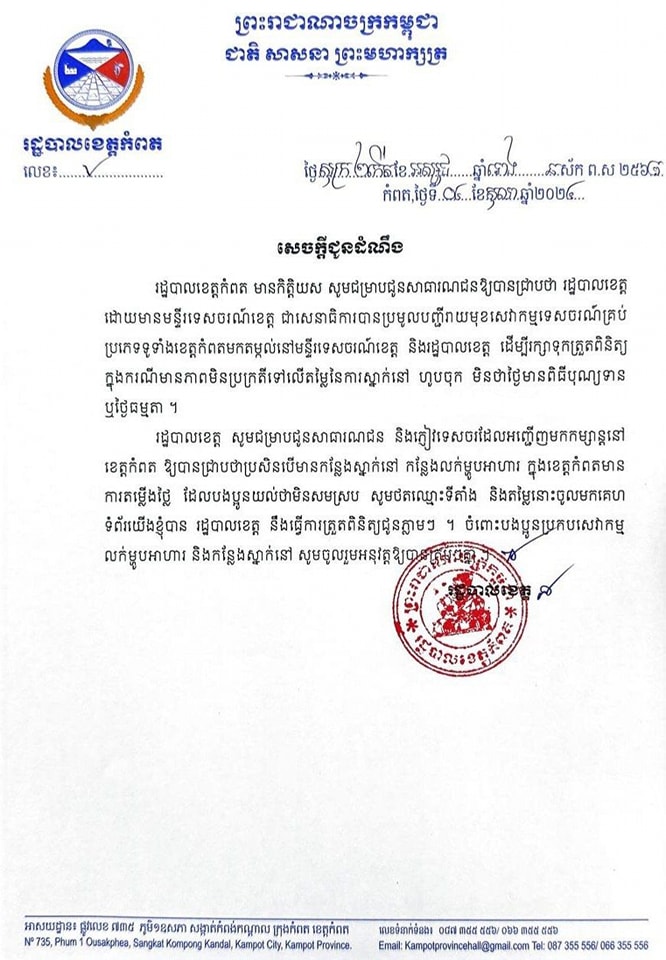 ខេត្តកំពត៖ ចួនពេលខេត្តកែបផ្ទុះរឿងម្ហូបអាហារមានតម្លៃថ្លៃហួសហេតុ ថ្នាក់ដឹកខេត្តកំពតឯណោះ ហាក់មានការប្រុងប្រយ័ត្នខ្ពស់ចំពោះរឿងនេះ។ ទំនងជាមិនចង់ឱ្យខេត្តខ្លួនជួបរឿងរបៀបនេះដែរ រដ្ឋបាលខេត្តកំពត កាលពីថ្ងៃសុក្រ ក៏ធ្វើសកម្មភាពទប់ស្កាត់ជាមុនឱ្យហើយ ដោយបានបញ្ជាមន្ទីរទេសចរណ៍ឱ្យចុះប្រមូលបញ្ជីតម្លៃមុខម្ភូបសេវាកម្មទេសចរណ៍គ្រប់ប្រភេទទូទាំងខេត្តតែម្តង ដើម្បីយកទៅពិនិត្យឡើងវិញ។