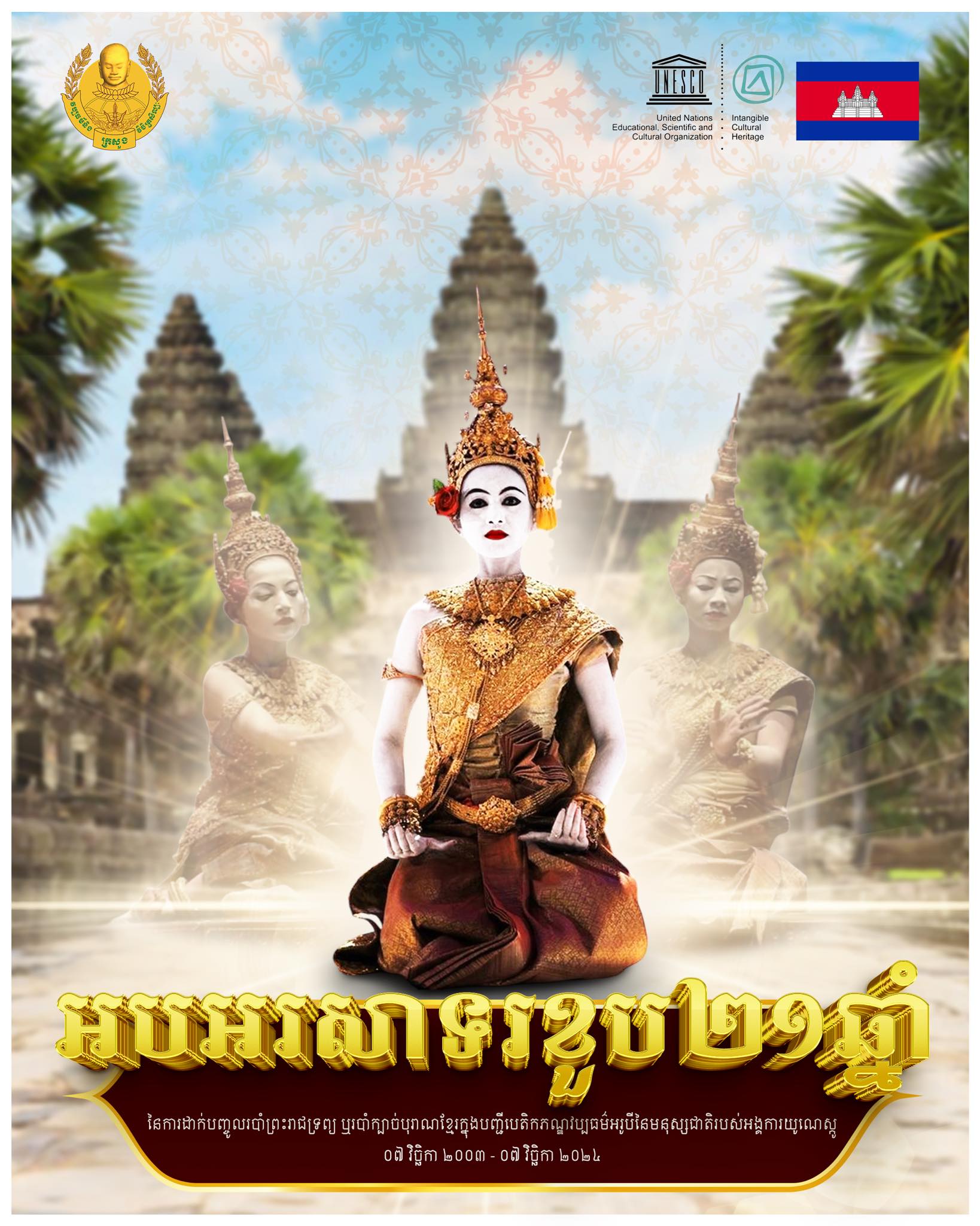 ក្រសួងវប្បធម៌នៅថ្ងៃទី៧ ខែវិច្ឆិកា ឆ្នាំ២០២៤ បានផ្ញើសារអបអរសាទរខួមទី២១ឆ្នាំដែល«របាំព្រះរាជទ្រព្យ» ឬរបាំ«ក្បាច់បុរាណខ្មែរ» ចុះក្នុងបញ្ជីបេតិកភណ្ឌវប្បធម៌អរូបីនៃមនុស្សជាតិរបស់អង្គការយូណេស្កូ នៅទីក្រុងអ៊ីស្តង់ប៊ុល ប្រទេសតួកគី។ ទន្ទឹមគ្នានោះក្រសួង បានក្រើនរំឭកថា៖«កិច្ចការពារបេតិកភណ្ឌវប្បធម៌ ជាភារកិច្ចរបស់កូនខ្មែរគ្រប់ៗរូប»។ របាំព្រះរាជទ្រព្យ (English: Royal Ballet of Cambodia) ជារបាំនៃកម្ពុជា មានភាពល្បីល្បាញខាងប្រណិតភាព នៃសម្លៀកបំពាក់ និងការតុបតែងកាយ បំពាក់គ្រឿងមាសប្រាក់ អមទៅដោយក្បាច់រាំ ដែលមានភាពទន់ភ្លន់ស្រស់ស្អាតគួរជាទីគយគន់ មើលទៅហាក់ដូចជារបាំរបស់ពពួកទេវៈ ឬទេវតា (Devata) ឈានទៅរកលំដាប់ខ្ពស់របស់របាំ ដែលយើងអាចសន្មតបានថាជា(ស្ដេចរបាំ King Of Ballet)។