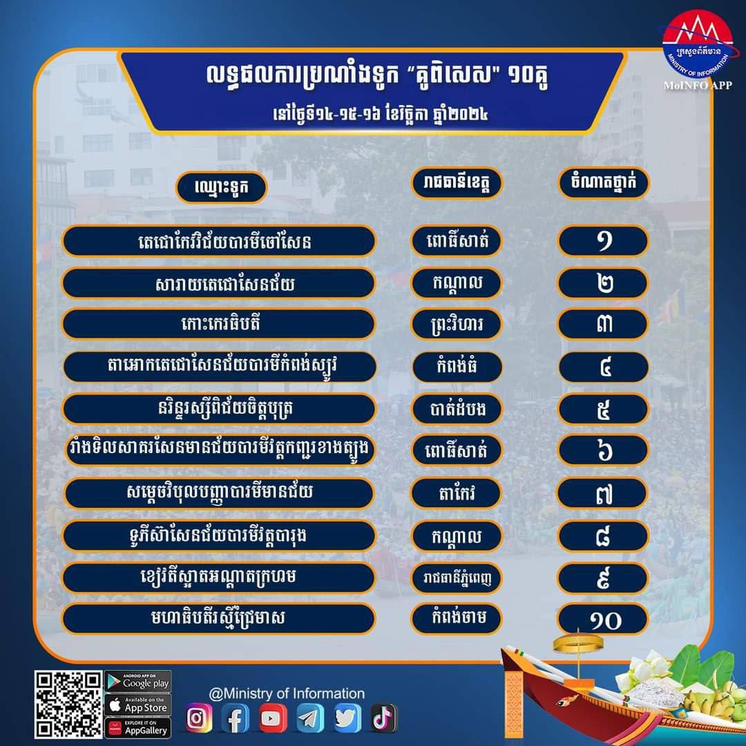 រាជធានីភ្នំពេញ៖ ព្រះរាជពិធីបុណ្យអុំទូក បណ្តែតប្រទីប សំពះព្រែខែ និងអកអំបុក បានបិតបញ្ចប់ក្រោមព្រះរាជាធិបតី ព្រះករុណា ព្រះបាទសម្តេច ព្រះបរមនាថ នរោត្តមសីហមុនី ព្រះមហាក្សត្រនៃព្រះរាជាណាចក្រកម្ពុជា ខណៈលទ្ធផលនៃការប្រណាំងទូករយៈពេល៣ថ្ងៃក៏បានរកឃើញជើងឯកប្រចាំឆ្នាំ២០២៤រួចហើយដែរ ក្នុងចំណោមគូពិសេសទាំង១០ ទូក «នរិន្ទរង្សីពិជ័យចិត្របុត្រ» ដែលល្បីខ្លាំងទាំងលើបណ្តាញសង្គម និងនៅខេត្តបាត់ដំបងនោះ ក៏បានជាប់ក្នុងតារាងទូកខ្លាំងទាំង១០ផងដែរ..។