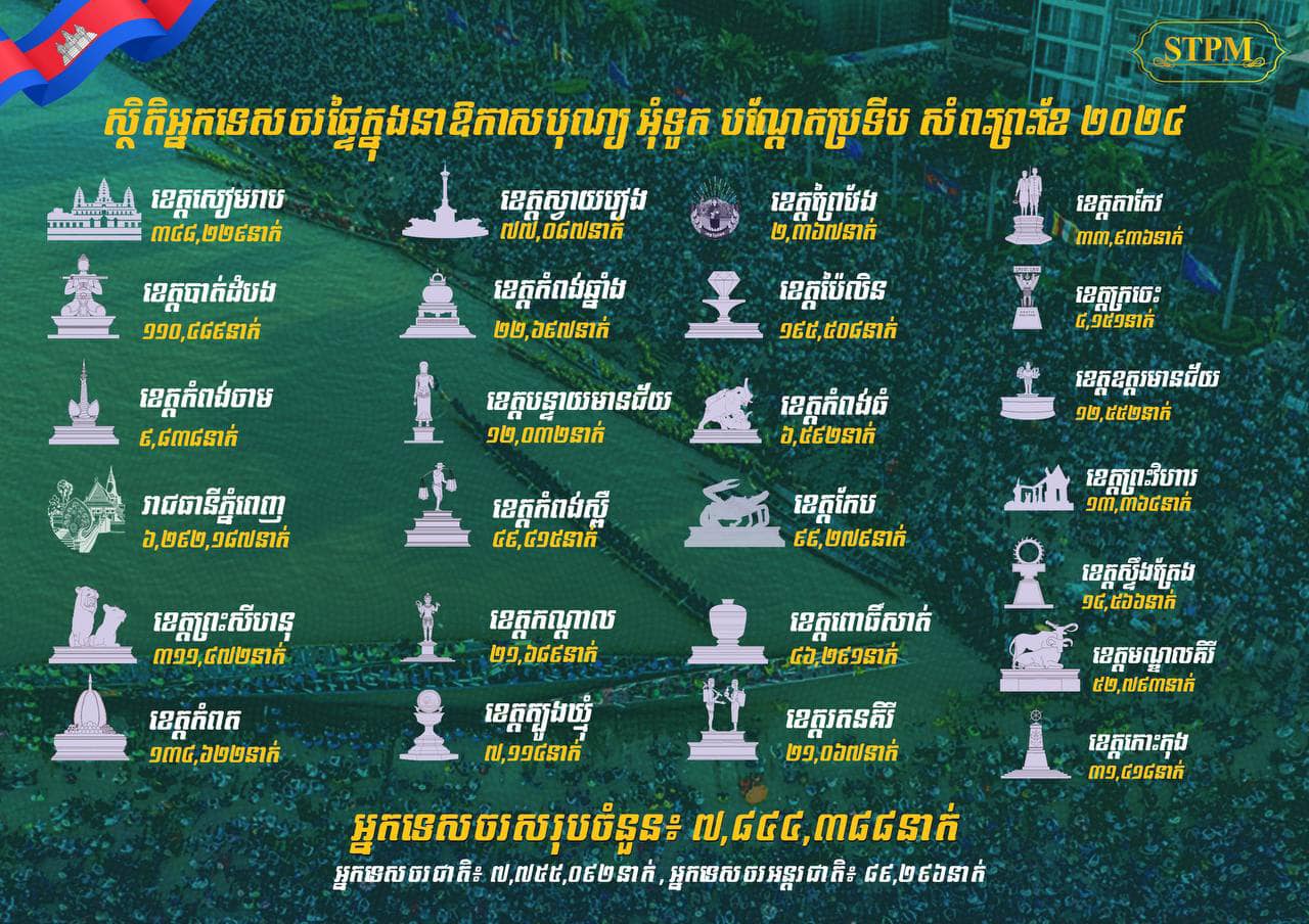 ក្រសួងបង្ហាញថា ទេសចរជាតិ និងអន្តរជាតិ សរុបប្រមាណជាង៧លាន៨សែននាក់ បានដើរកម្សាន្តទូទាំងប្រទេសក្នុងពិធីបុណ្យអុំទូក ចាប់ពីថ្ងៃទី១៤ដល់ថ្ងៃទី១៦ ខែវិច្ឆិកា។ ក្នុងនោះទេសចរជាតិ ប្រមាណជាង៧លាន៧សែននាក់ កើនឡើង២១,៤ភាគរយ ចំណែកភ្ញៀវទេសចរអន្តរជាតិមានជាង៨ម៉ឺន៩ពាន់នាក់ កើនឡើង២៨,៧ភាគរយ បើធៀបនឹងរយៈពេលដូចគ្នាឆ្នាំ២០២៣។ ទន្ទឹមគ្នានោះ មាន រាជធានី-ខេត្តចំនួន៥ ស្រូបទាញអ្នកទេសចរច្រើនជាងគេរួមមាន៖ រាជធានីភ្នំពេញ ទទួលបានទេសចរជាតិ និងប្រជាពលរដ្ឋជាង៦លាន២សែននាក់ ខណៈទេសចរបរទេសប្រមាណជាង៥ម៉ឺននាក់។ ដោយឡែក ខេត្តសៀមរាប សម្បូរដោយសក្តានុពលទេសចរណ៍ ទាំងផ្នែកវប្បធម៌ បេតិកភណ្ឌ ក៏ដូចជាធម្មជាតិ ទទួលបានភ្ញៀវទេសចរជាតិជាង៣សែន៣ម៉ឺននាក់ និងទេសចរបរទេសជាង១ម៉ឺននាក់។