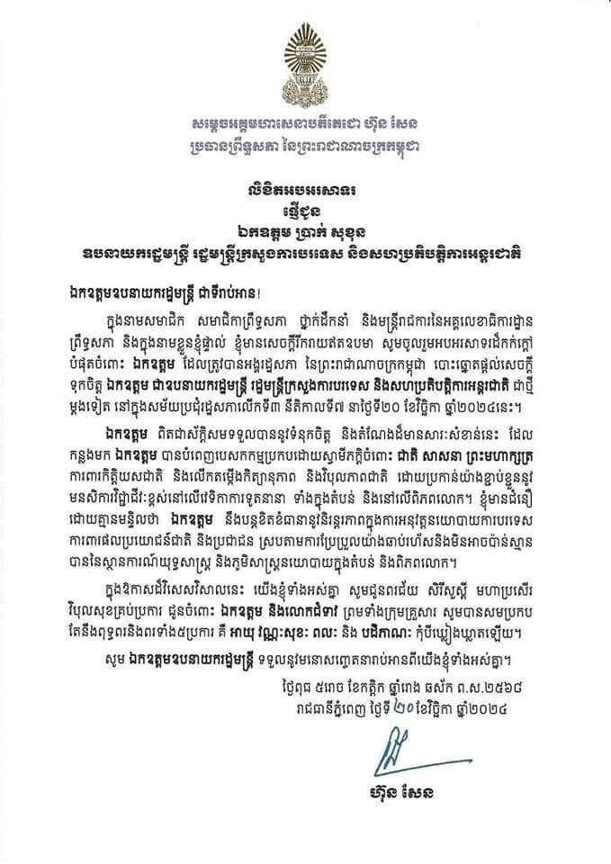ក្នុងសារលិខិតអបអរសាទរ លោក ឧបនាយករដ្ឋមន្ត្រី ប្រាក់ សុខុន ដែលត្រូវបានរដ្ឋសភាបោះឆ្នោតផ្តល់សេចក្តីទុកចិត្ត ជារដ្ឋមន្ត្រីក្រសួងការបរទេស និងសហប្រតិបត្តិការអន្តរជាតិជាថ្មីម្ដងទៀត ចុះថ្ងៃទី២០ ខែវិច្ឆិកា ឆ្នាំ២០២៤ សម្ដេចតេជោ គូសបញ្ជាក់ថា៖«ខ្ញុំមានជំនឿដោយគ្មានមន្ទិលថា ឯកឧត្តម [ប្រាក់ សុខុន] នឹងបន្តខិតខំធានានូវនិរន្តរភាពក្នុងការអនុវត្តនយោបាយការបរទេស ការពារផលប្រយោជន៍ជាតិ និងប្រជាជន ស្របតាមការប្រែប្រួលយ៉ាងឆាប់រហ័ស និងមិនអាចប៉ាន់ស្មានបាននៃស្ថានការណ៍យុទ្ធសាស្ត្រ និងភូមិសាស្ត្រនយោបាយក្នុងតំបន់ និងពិភពលោក»។