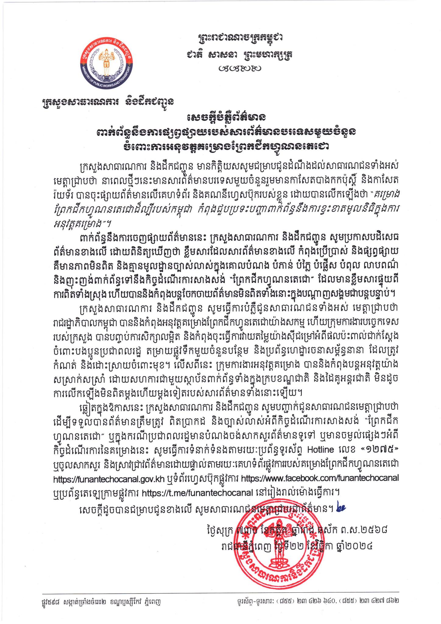 ក្រសួងសាធារណការគូសបញ្ជាក់ថា៖«[..]ខ្លឹមសារដែលសារព័ត៌មាននោះ កំពុងប្រើប្រាស់ និងផ្សព្វផ្សាយ គឺមានភាពមិនពិត និងគ្មានមូលដ្ឋានច្បាស់លាស់ក្នុងគោលបំណង បំភាន់ បំភ្លៃ បំផ្លើស បំពុល លាបពណ៌ និងញុះញង់ ពាក់ព័ន្ធទៅនឹងកិច្ចដំណើរការសាងសង់ [ព្រែកជីកហ្វូណនតេជោ] ដែលមានខ្លឹមសារផ្ទុយពីការពិតទាំងស្រុង ហើយបាននិងកំពុងបន្តចែកចាយព័ត៌មានមិនពិតទាំងនោះក្នុងបណ្តាញសង្គមជាបន្តបន្ទាប់»។