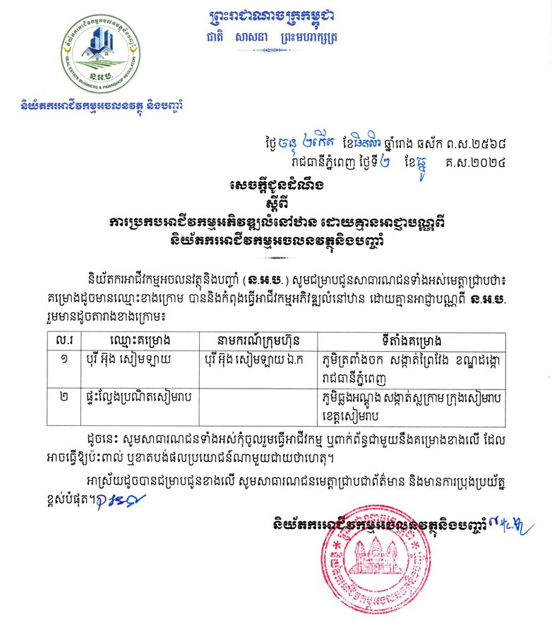 និយ័តករអាជីវកម្មអចលនវត្ថុ និងបញ្ចាំ នៃអាជ្ញាធរសេវាហិរញ្ញវត្ថុមិនមែនធនាគារ បានឱ្យដឹងយ៉ាងដូច្នេះថា សូមជម្រាបជូនសាធារណជនទាំងអស់មេត្តាជ្រាបថា គម្រោងចំនួនពីរបាននិងកំពុងកំពុងធ្វើអាជីវកម្មអភិវឌ្ឍលំនៅឋាន ដោយគ្មានអាជ្ញាបណ្ណពី ន.អ.ប.។ គម្រោងទាំងនោះរួមមាន៖ ទី១.ឈ្មោះ បុរី អ៊ុង សៀមឡាយ មានទីតាំងស្ថិតនៅភូមិត្រពាំងចក សង្កាត់ព្រៃវែង ខណ្ឌដង្កោ រាជធានីភ្នំពេញ។ ទី២.ផ្ទះល្វែងប្រណិតសៀមរាប មានទីតាំងគម្រោង ភូមិឆ្លងអណ្តូង សង្កាត់ស្លក្រាម ក្រុងសៀមរាប ខេត្តសៀមរាប។ ដូច្នេះ ន.អ.ប. សូមជម្រាបជូនដល់សាធារណជនទាំងអស់ សូមកុំចូលរួមធ្វើអាជីវកម្ម ឬពាក់ព័ន្ធជាមួយនឹងគម្រោងខាងលើ ដែលអាចធ្វើឱ្យប៉ះពាល់ ឬខាតបង់ផលប្រយោជន៍ណាមួយជាយថាហេតុ។ អាស្រ័យដូចបានជម្រាបជូនខាងលើសូមសាធារណជនមេត្តាជ្រាបជាព័ត៌មាន និងមានការប្រុងប្រយ័ត្នខ្ពស់បំផុត៕