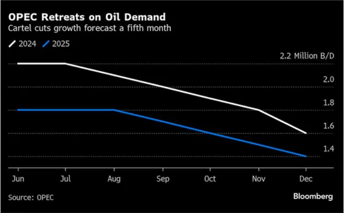 នៅក្នុងរបាយការណ៍ទីផ្សារប្រេងប្រចាំខែរបស់ខ្លួនសម្រាប់ខែធ្នូ OPEC រំពឹងថា នឹងមានកំណើនតម្រូវការប្រេងពិភពលោកចំនួន១,៦១លានបារ៉ែលក្នុងមួយថ្ងៃសម្រាប់ឆ្នាំ២០២៤ ធ្លាក់ចុះប្រហែល២១០ 000លានបារ៉ែលក្នុងមួយថ្ងៃ ពីចំនួន១,៨២ លានបារ៉ែលក្នុងមួយថ្ងៃ ដែលបានព្យាករកាលពីខែមុន។ ទន្ទឹមនឹងនេះ អង្គការ OPEC ប៉ាន់ប្រមាណថា កំណើនតម្រូវការប្រេងពិភពលោកឆ្នាំ២០២៥ មានចំនួន១,៤៥ លានបារ៉ែលក្នុងមួយថ្ងៃធ្លាក់ចុះ៩ម៉ឺនលានបារ៉ែលក្នុងមួយថ្ងៃ ធៀបនឹងការវាយតម្លៃកាលពីខែមុនដែលមានចំនួន១,៥៤លានបារ៉ែលក្នុងមួយថ្ងៃ។ ទោះជាយ៉ាងណាក៏ដោយ អង្គការបានទទូចថា ការព្យាករបានកែសម្រួលនៅតែសម្គាល់កម្រិតកំណើន ដែលមានសុខភាពល្អបើប្រៀបធៀបទៅនឹងមធ្យមភាគមុនមានជំងឺរាតត្បាតកូវីដ-១៩។
