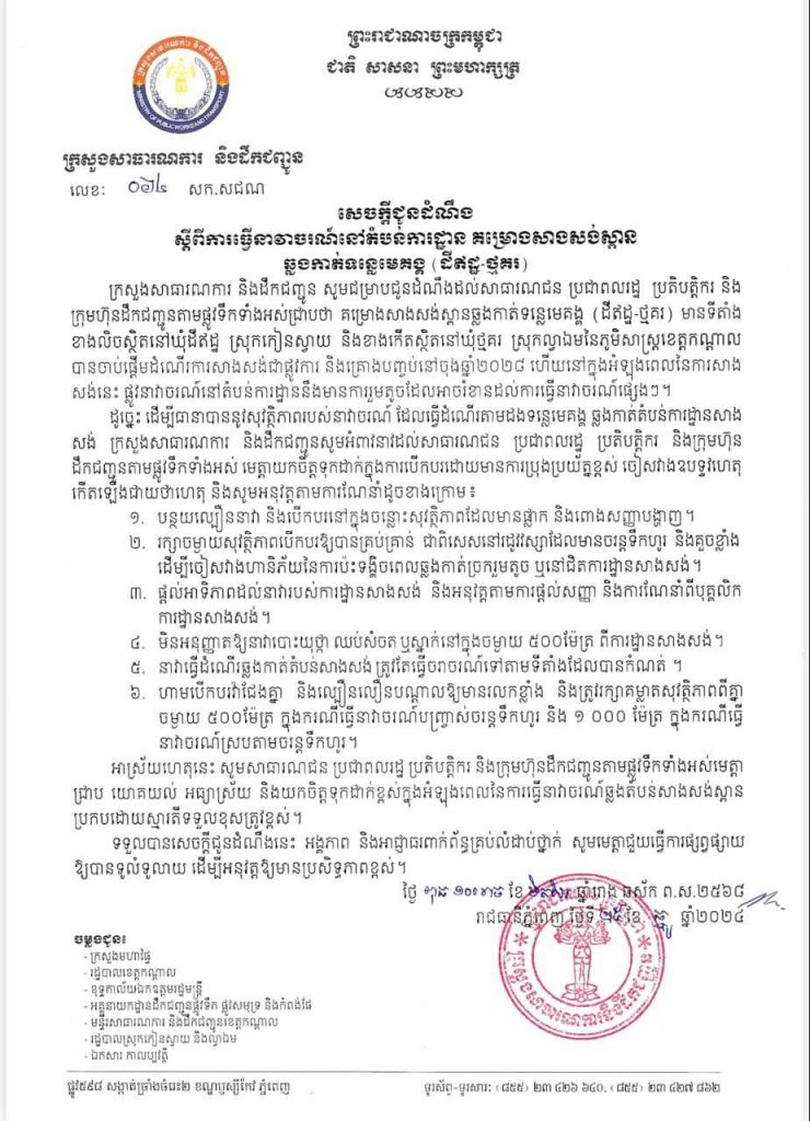 តាមក្រសួង គម្រោងសាងសង់ស្ពានឆ្លងកាត់ទន្លេមេគង្គ (ដីឥដ្ឋ-ថ្មគរ) ភាគខាងលិច ស្ថិតនៅឃុំដីឥដ្ឋ ស្រុកកៀនស្វាយ និងខាងកើតស្ថិតនៅឃុំថ្មគរ ស្រុកល្វាឯមនៃភូមិសាស្ត្រខេត្តកណ្តាល បានចាប់ផ្តើមដំណើរការសាងសង់ជាផ្លូវការ និងគ្រោងបញ្ចប់នៅចុងឆ្នាំ២០២៨។ ហេតុនេះ ក្រសួងថា ក្នុងអំឡុងពេលនៃការសាងសង់ផ្លូវនាវាចរណ៍នៅតំបន់ការដ្ឋាន នឹងមានការរួមតូចដែលអាចរំខានដល់ការធ្វើនាវាចរណ៍ផ្សេងៗ។ ដូច្នេះ ប្រជាពលរដ្ឋ ប្រតិបត្តិករ និងក្រុមហ៊ុន ដឹកជញ្ជូនតាមផ្លូវទឹកទាំងអស់ ត្រូវរក្សាចម្ងាយសុវត្ថិភាពបើកបរឱ្យបានគ្រប់គ្រាន់ ជាពិសេសនៅរដូវវស្សាដែលមានចរន្តទឹកហូរ និងគួចខ្លាំង ដើម្បីចៀសវាងហានិភ័យនៃការប៉ះទង្គិចពេលឆ្លងកាត់ច្រករួមតូច ឬនៅជិតការដ្ឋានសាងសង់។