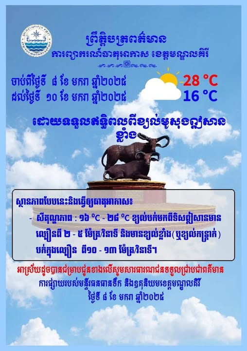 មន្ទីរធនធានទឹកបានអះអាងថា៖ ដោយទទួលឥទ្ធិពលពីខ្យល់មូសុងឦសានខ្លាំងស្ថានភាពបែបនេះធ្វើឱ្យខេត្តមណ្ឌលគិរីមានសីតុណ្ហភាពពី១៦អង្សាសេដល់២៨អង្សាសេ។ ជាមួយគ្នា ក្រសួងធនធានទឹក ក៏បានចេញសេចក្តីជូនដំណឹងដែរថា ចាប់ពីថ្ងៃទី៨ដល់ថ្ងៃទី១០ខែមករា ឆ្នាំ២០២៥ តំបន់វាលទំនាប នឹងមានសីតុណ្ហភាពមធ្យមអប្បបរមា២០អង្សាសេ និងសីតុណ្ហភាពមធ្យមអតិបរមា៣២អង្សាសេ។ ខ្យល់បក់មកពីទិសឦសាន និងឧត្តរមានល្បឿនមធ្យម៣ម៉ែត្រក្នុងមួយវិនាទី។