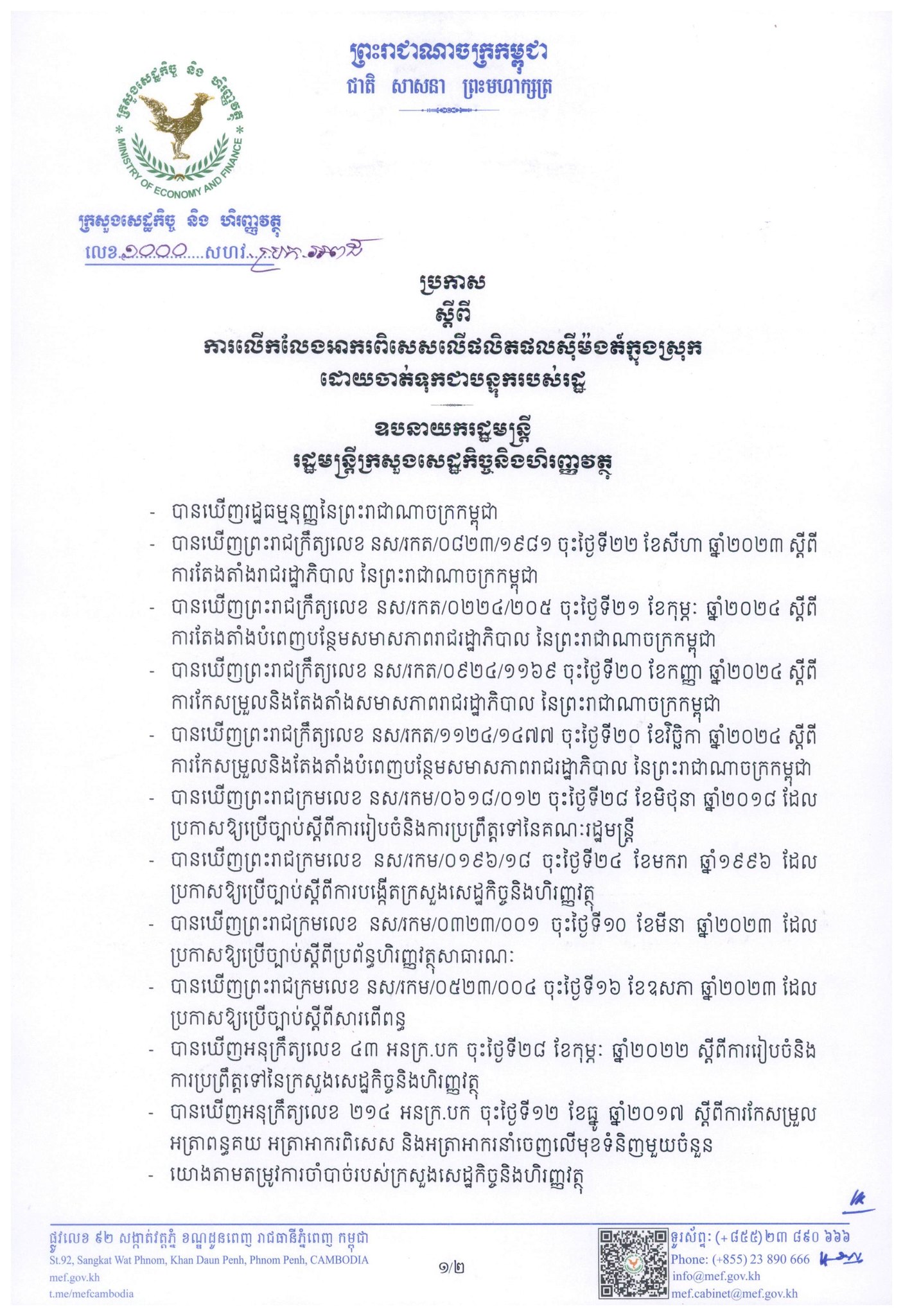 រាជធានីភ្នំពេញ៖ រាជរដ្ឋាភិបាល តាមរយៈក្រសួងសេដ្ឋកិច្ច និងហិរញ្ញវត្ថុ បានសម្រេចលើកលែងអាករពិសេសលើផលិតផលស៊ីម៉ងត៍ក្នុងស្រុក ដោយចាត់ទុកជាបន្ទុករបស់រដ្ឋ នូវអាករពិសេសតាមអត្រា៥ភាគរយ សម្រាប់រយៈពេល២ឆ្នាំ ចាប់ពីឆ្នាំ២០២៥ រហូតដល់ដំណាច់ឆ្នាំ២០២៦។ តាមសេចក្ដីប្រកាសរបស់ក្រសួងសេដ្ឋកិច្ច ចុះថ្ងៃទី៣១ ខែធ្នូ ឆ្នាំ២០២៤ ដែលទើបត្រូវបានផ្សាយជាសាធារណៈនៅព្រឹកថ្ងៃទី១៤ ខែមករា ឆ្នាំ២០២៥នេះ បានឱ្យដឹងថា ការសម្រេចលើកលែងអាករពិសេសលើផលិតផលស៊ីម៉ងត៍ក្នុងស្រុកនេះ គឺដើម្បីចូលរួមគាំទ្រដល់ឧស្សាហកម្មផលិតស៊ីម៉ងត៍ក្នុងស្រុក។