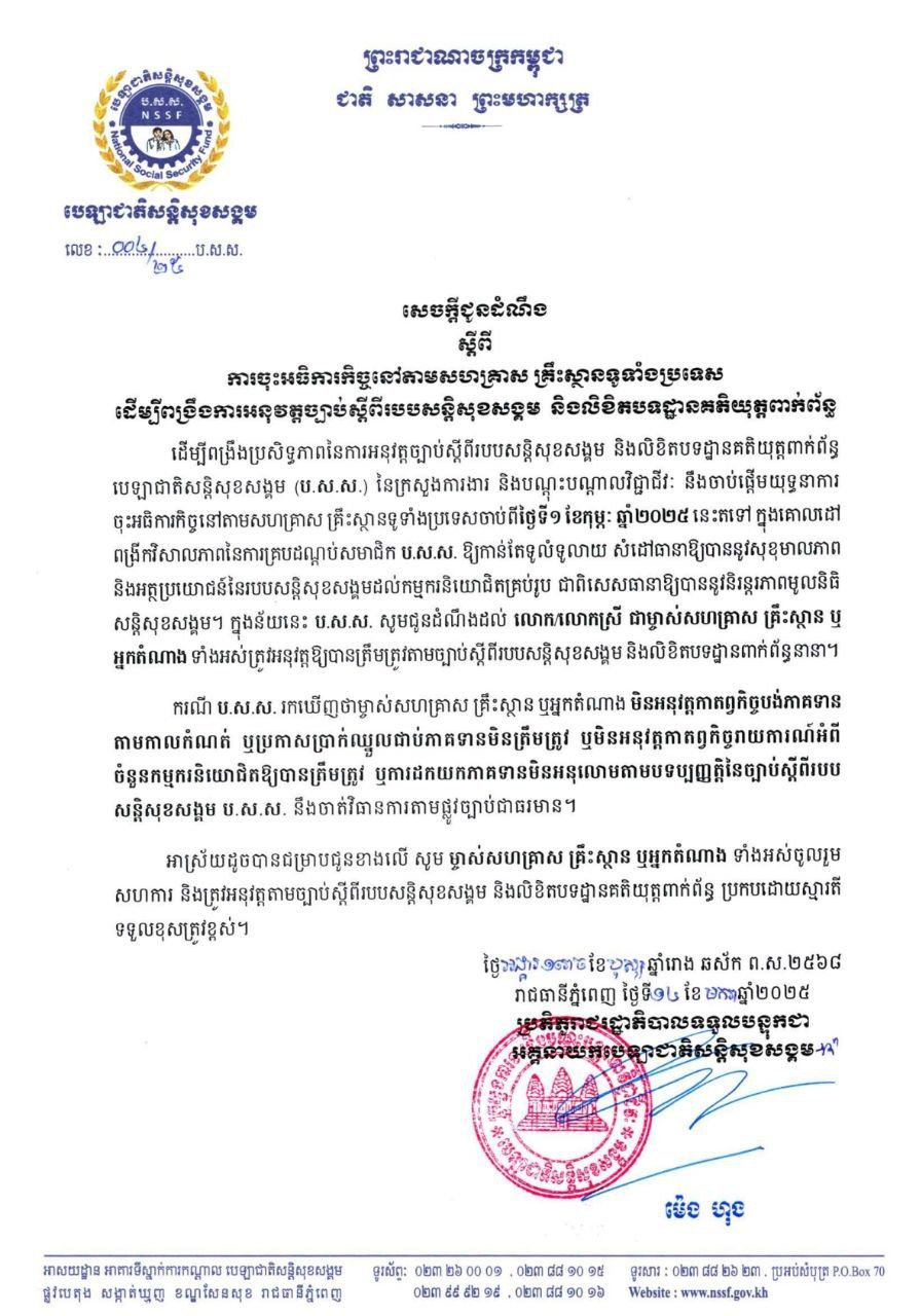 រាជធានីភ្នំពេញ៖ បេឡាជាតិសន្តិសុខសង្គម ដែលហៅកាត់ថា ប.ស.ស កាលពីល្ងាចថ្ងៃទី១៤មករា ឆ្នាំ២០២៥ បានចេញមកបញ្ជាក់ច្បាស់ៗថា បើរកឃើញមានម្ចាស់សហគ្រាស គ្រឹះស្ថាន ឬអ្នកតំណាង មិនអនុវត្តកាតព្វកិច្ចបង់ភាគទានតាមកាលកំណត់, មិនប្រកាសប្រាក់ឈ្នួលជាប់ភាគទានដោយមិនត្រឹមត្រូវ, អត់អនុវត្តកាតព្វកិច្ចរាយការណ៍ពីចំនួនកម្មករនិយោជិតឱ្យបានត្រឹមត្រូវ នឹងចាត់វិធានការតាមផ្លូវច្បាប់គ្មានការលើកលែងនោះទេ…។