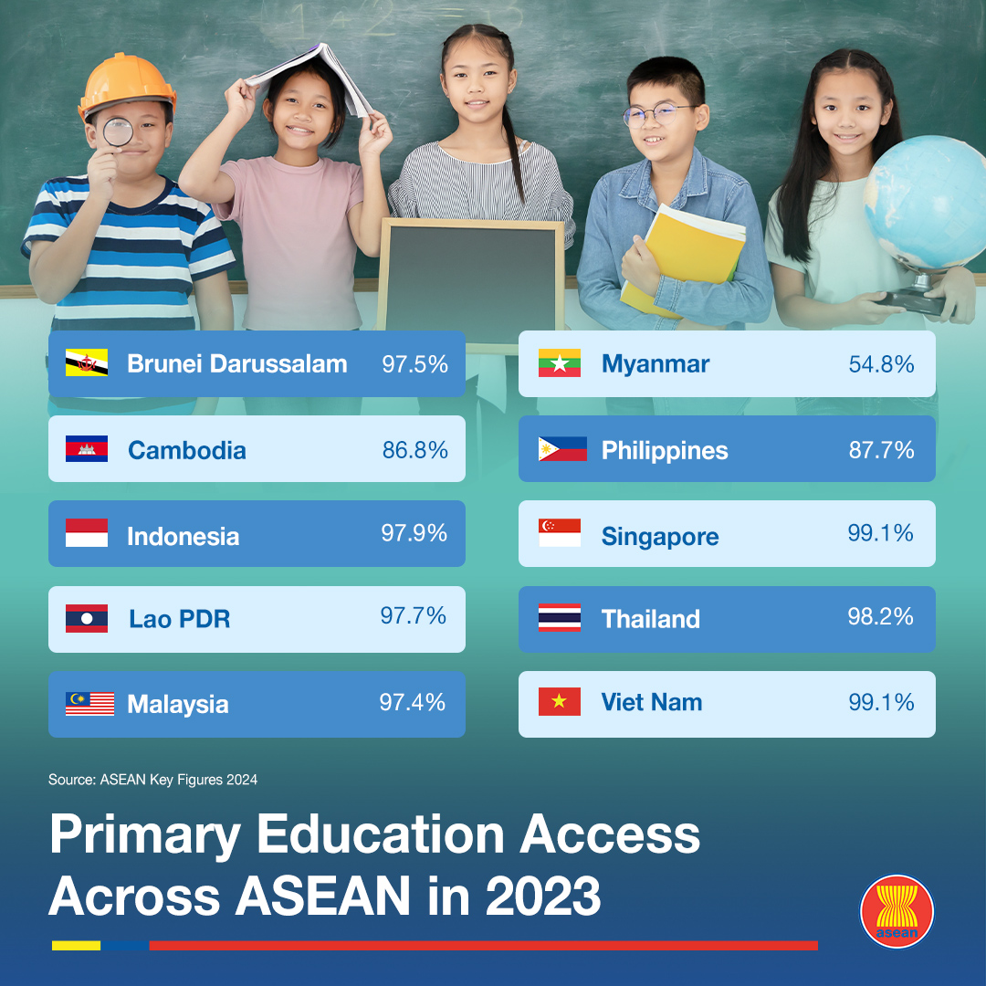 ក្រៅពីសិង្ហបុរី និងវៀតណាម ថៃជាប្រទេសបន្ទាប់ដែលមានអត្រាកុមារចុះឈ្មោះចូលរៀនបឋមសិក្សារហូតដល់៩៨,២ភាគរយ។ បន្ទាប់មកទៀតគឺ ប្រទេសឥណ្ឌូណេស៊ី មានអត្រាកុមារចុះឈ្មោះចូលរៀនសរុបចំនួន៩៧,៩ភាគរយ។ មិនអន់ប៉ុន្មានទេ! ឡាវ មានអត្រាកុមារចុះឈ្មោះចូលរៀនរហូតដល់៩៧,៧ភាគរយ តាមពីក្រោយដោយ ប្រទេសប្រ៊ុយណេ មានអត្រាកុមារចុះឈ្មោះចូលរៀនចំនួន៩៧,៥ភាគរយ។