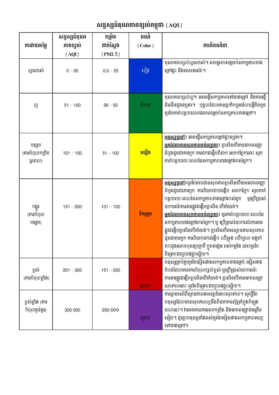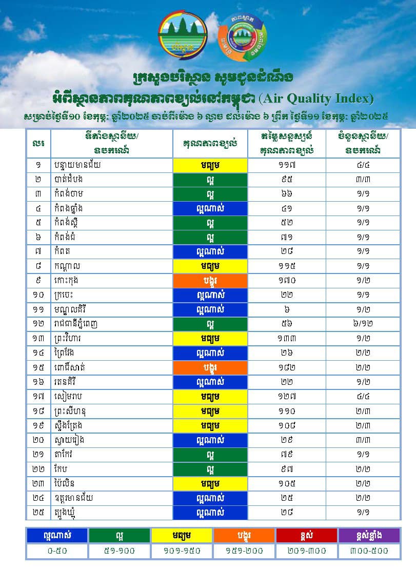 ដោយទ្បែក រាជធានីភ្នំពេញ ខេត្តបាត់ដំបង ខេត្តកំពង់ចាម ខេត្តកំពង់ស្ពឺ ខេត្តកំពង់ធំ ខេត្តតាកែវ និងខេត្តកែប ស្ថិតក្នុងពណ៌បៃតង បញ្ជាក់ថា គុណភាពខ្យល់ល្អ អាចចេញទៅខាងក្រៅជាធម្មតា តែបុគ្គលដែលមានប្រតិកម្មអាលែហ្ស៊ីតិចតួចគួរតែកាត់បន្ថយពេលវេលាដែលចេញទៅខាងក្រៅ។ រីឯ ខេត្តកំពង់ឆ្នាំង ខេត្តកំពត ខេត្តស្វាយរៀង ខេត្តក្រចេះ ខេត្តព្រៃវែង ខេត្តរតនគិរី ខេត្តឧត្តរមានជ័យ ខេត្តមណ្ឌលគីរី និងខេត្តត្បូងឃ្មុំ ស្ថិតក្នុងពណ៌ខៀវ បញ្ជាក់ថា គុណភាពខ្យល់ល្អណាស់ អាចចេញក្រៅផ្ទះបានដោយគ្មានការព្រួយបារម្ភនោះទ្បើយ៕