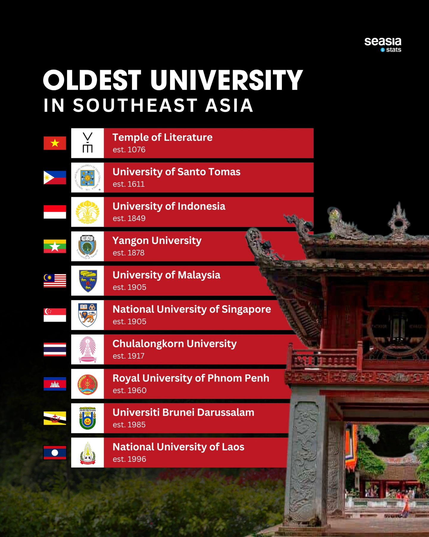 សាកលវិទ្យាល័យ Temple of Literature ប្រទេសវៀតណាម៖ សាកលវិទ្យាល័យនេះ ជាសាកលវិទ្យាល័យមានវ័យចំណាស់បំផុតនៅអាស៊ីអាគ្នេយ៍ ដោយមានអាយុកាលចាប់តាំងពីឆ្នាំ១០៧០។ សាកលវិទ្យាល័យនេះ មិនត្រឹមតែជាសម្បត្តិវប្បធម៌ និងប្រវត្តិសាស្ត្រប៉ុណ្ណោះទេ ប៉ុន្តែវាក៏ជាកន្លែងដែលសិស្សានុសិស្សជាច្រើនទៅបួងសួងសុំសំណាងល្អក្នុងការប្រឡង និងការសិក្សា ហើយក៏ជាទីតាំងទេសចរណ៍ប្រវត្តិសាស្ត្រដ៏ពេញនិយមនៅរដ្ឋធានីហាណូយផងដែរ។