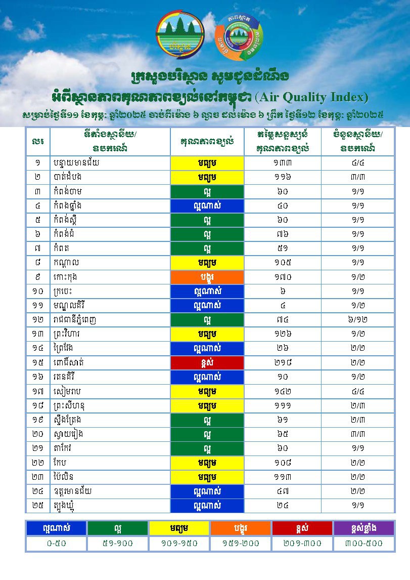 ខេត្តពោធិ៍សាត់៖ ក្រសួងបរិស្ថាន នៅថ្ងៃទី១២កុម្ភៈ ឆ្នាំ២០២៥ បានព្យាករឃើញថា គិតត្រឹមម៉ោង៦ព្រឹកថ្ងៃទី១២កុម្ភៈនេះ ខេត្តពោធិ៍សាត់រងការបំពុលខ្យល់ខ្លាំង ដូច្នេះ ក្រសួងអំពាវនាវដល់ប្រជាពលរដ្ឋរស់នៅក្នុងខេត្តខាងលើ ត្រូវប្រុងប្រយ័ត្នឱ្យបានខ្ពស់បំផុត…។