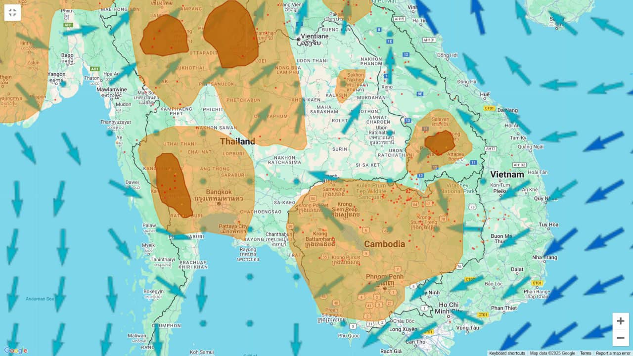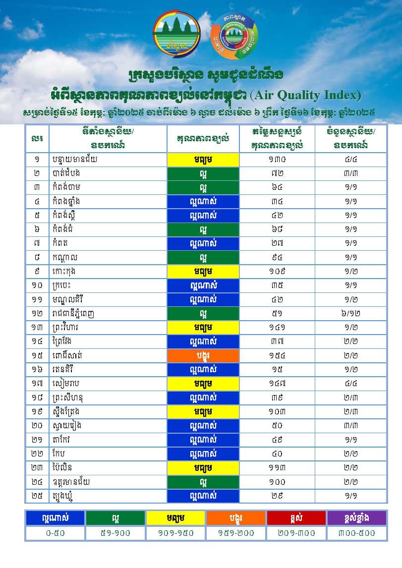 ដោយទ្បែក រាជធានីភ្នំពេញ ខេត្តបាត់ដំបង ខេត្តកំពង់ចាម ខេត្តកំពង់ធំ ខេត្តកណ្តាល និងខេត្តឧត្តរមានជ័យ ស្ថិតក្នុងពណ៌បៃតង បានន័យថា គុណភាពខ្យល់ល្អ។ ចំពោះ ខេត្តកំពង់ឆ្នាំង ខេត្តព្រៃវែង ខេត្តកំពត ខេត្តស្វាយរៀង ខេត្តតាកែវ ខេត្តកែប ខេត្តរតនគិរី ខេត្តព្រះសីហនុ ខេត្តក្រចេះ ខេត្តមណ្ឌលគីរី ខេត្តកំពង់ស្ពឺ និងខេត្តត្បូងឃ្មុំ ស្ថិតក្នុងពណ៌ខៀវ គុណភាពខ្យល់ល្អណាស់ អាចធ្វើដំណើរចេញទៅក្រៅបានជាធម្មតា៕