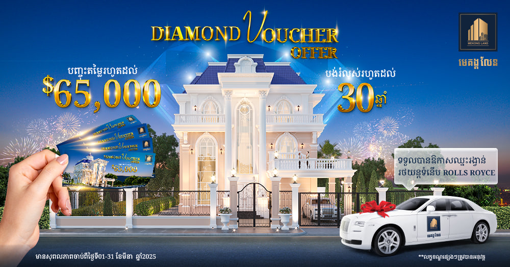 រាជធានីភ្នំពេញ៖ មានលុយតិចក៏អាចក្លាយជាម្ចាស់កម្មសិទ្ធិប្លង់រឹងភ្លាមៗបានដែរ! សម្រាប់ខែមីនា ឆ្នាំ២០២៥នេះ បុរី មេគង្គ លែន មានប្រូម៉ូសិនពិសេសដែលមិនធ្លាប់មានពីមុនមកគឺ «DIAMOND VOUCHER OFFER» ដែលអតិថិជននឹងចំណេញបានច្រើន រួមនឹងឱកាសក្លាយជាម្ចាស់ផ្ទះភ្លាមៗនៅក្នុងខែមីនានេះ។