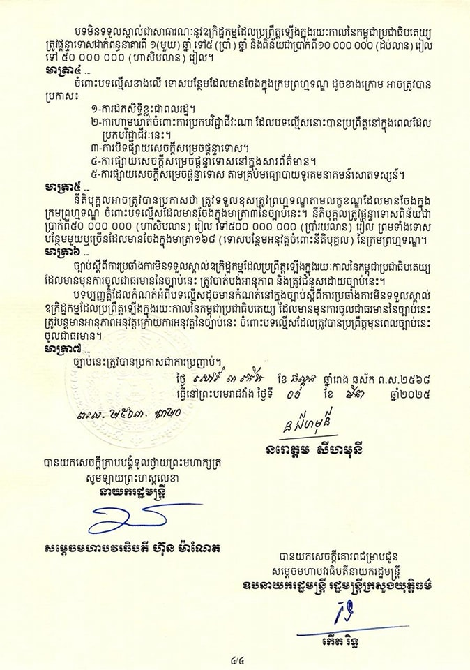 រាជធានីភ្នំពេញ៖ អ្នកណា មិនទទួលស្គាល់ ឬបដិសេធ ឬជំទាស់ ឬនិយាយថា មិនមានរបបខ្មែរក្រហម អ្នកនោះ អាចនឹងត្រូវហាមឃាត់មិនឱ្យប្រកបវិជ្ជាជីវៈរបស់ខ្លួន ក្នុងរយៈពេលណាមួយតាមការកំណត់របស់តុលាការ។ នេះបើផ្អែកលើខ្លឹមសារនៃច្បាប់ថ្មី ដែលព្រះមហាក្សត្រជាអម្ចាស់ជីវិតតម្កល់លើត្បូង ទ្រង់ទើបនឹងចេញព្រះរាជក្រមដាក់ឱ្យប្រើប្រាស់ នៅថ្ងៃទី១ ខែមីនា ឆ្នាំ២០២៥ បន្ទាប់ពីរដ្ឋសភា និងព្រឹទ្ធសភា អនុម័តចប់សព្វគ្រប់។
