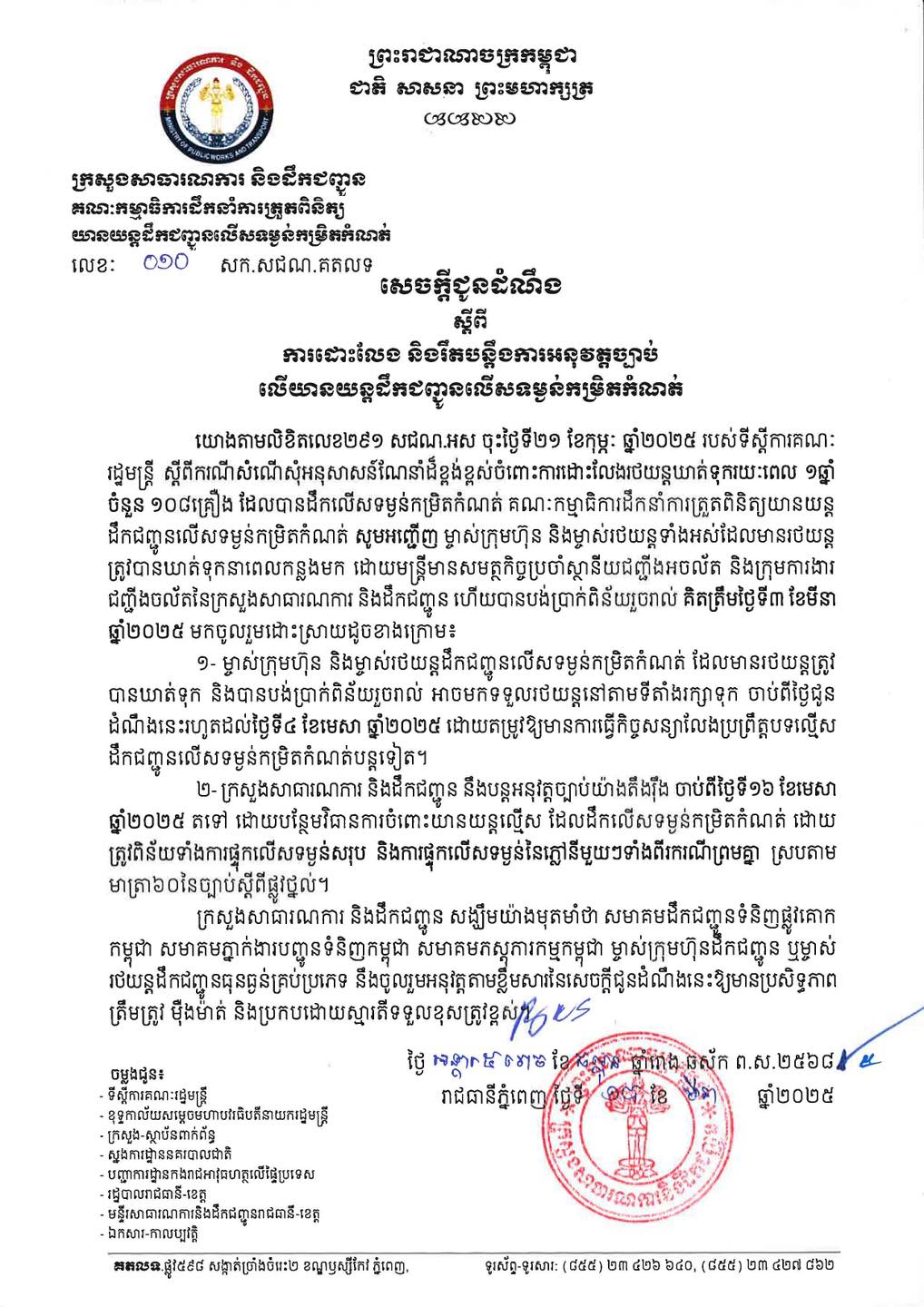 គណៈកម្មាធិការដឹកនាំការត្រួតពិនិត្យយានយន្ត ដឹកជញ្ជូនលើសទម្ងន់កម្រិតកំណត់ នៅថ្ងៃទី១៩មីនា ឆ្នាំ២០២៥នេះ បានអញ្ជើញឱ្យម្ចាស់ក្រុមហ៊ុន និងម្ចាស់រថយន្តទាំងអស់ ដែលមានរថយន្តត្រូវបានឃាត់ទុកដោយមន្ត្រីមានសមត្ថកិច្ចប្រចាំស្ថានីយជញ្ជីងអចល័ត និងក្រុមការងារជញ្ជីងចល័តនៃក្រសួងសាធារណការ ហើយបានបង់ប្រាក់ពិន័យរួចរាល់ គិតត្រឹមថ្ងៃទី៣ ខែមីនា អាចទៅទទួលរថយន្តនៅតាមទីតាំងរក្សាទុក ចាប់ពីថ្ងៃជូនដំណឹងនេះរហូតដល់ថ្ងៃទី៤ ខែមេសា។ ការប្រគល់រថយន្តជូនវិញ ស្ថាប័នជំនាញក៏តម្រូវឱ្យម្ចាស់រថយន្តទាំងនោះ ធ្វើកិច្ចសន្យាលែងប្រព្រឹត្តបទល្មើសដឹកជញ្ជូនលើសទម្ងន់កម្រិតកំណត់បន្តទៀត។