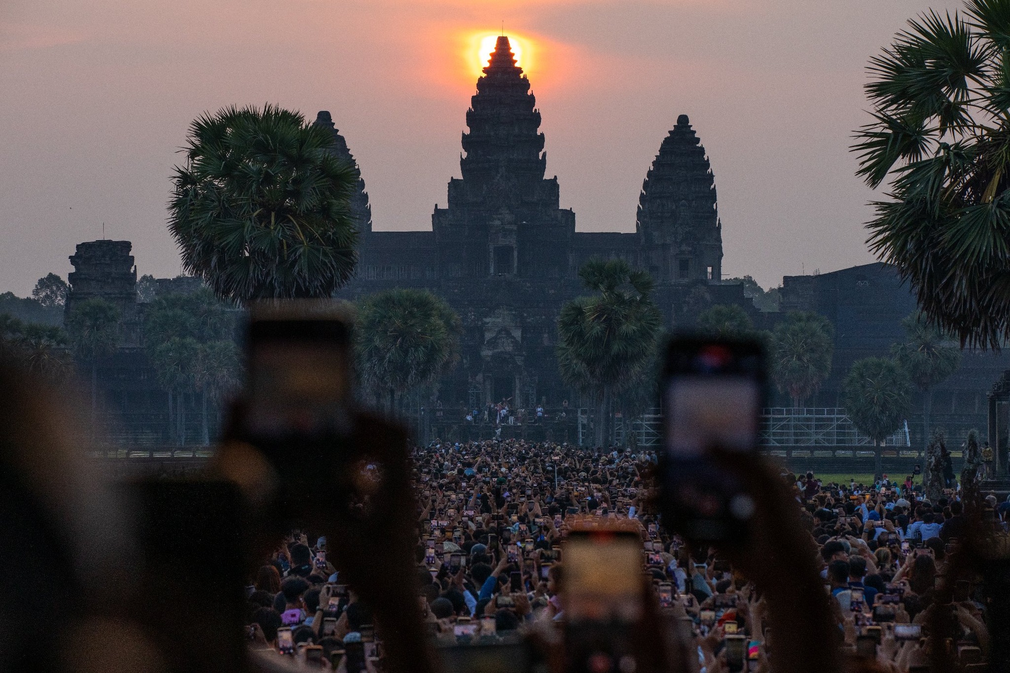 អាជ្ញាធរជាតិអប្សរាបញ្ជាក់ថា ក្នុងចំណោមភ្ញៀវទេសចរជិត៤ម៉ឺននាក់ដែលមកទស្សនាទិដ្ឋភាពថ្ងៃរះចំកំពូលកណ្តាលប្រាសាទអង្គរវត្ត ភ្ញៀវទេសចរជាតិ មានជាង៣,៣ម៉ឺននាក់ និងភ្ញៀវទេសចរបរទេស មានជាង៣,៥ពាន់នាក់។ សូមរំឭកថា ក្នុងថ្ងៃទី១នៃបាតុភូតនេះ គឺថ្ងៃទី២១មីនា បានស្រូបទាញភ្ញៀវទេសចរប្រមាណជាង២ម៉ឺននាក់។ ព្រឹត្តិការណ៍សមរាត្រីនៅប្រាសាទអង្គរវត្ត ឆ្នាំ២០២៥ ជាបាតុភូតព្រះអាទិត្យរះចំកណ្តាលកំពូលប្រាសាទអង្គរវត្ត កើតឡើងនៅចន្លោះថ្ងៃទី២១ដល់ថ្ងៃទី២៣ ខែមីនា ចាប់ពីវេលាម៉ោង៥ទីទៀបភ្លឺដល់ម៉ោង៧ព្រឹក។ នេះបើតាមការបញ្ជាក់របស់ក្រសួងទេសចរណ៍។