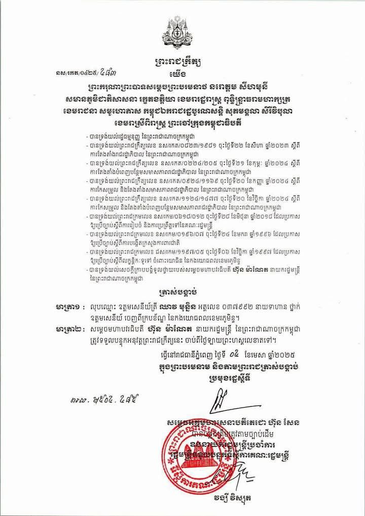 រាជធានីភ្នំពេញ៖ លោកឧត្តសេនីយ៍ត្រី ឈាវ មុន្និន ត្រូវបានដកចេញពីក្របខ័ណ្ឌនៃកងយោធពលខេមរភូមិន្ទ។ នេះបើយោងតាមព្រះរាជក្រឹត្យ ចេញនៅថ្ងៃទី៤ ខែមេសា ឆ្នាំ២០២៥ តាមសំណើរបស់សម្តេចនាយករដ្ឋមន្រ្តី ហ៊ុន ម៉ាណែត។ ការដកលោកផ្កាយ១វ័យក្មេង ឈាវ មុន្និន ចេញពីក្របខ័ណ្ឌ កើតឡើងបន្ទាប់ពីលោកបានបង្ហោះវីដេអូមួយចំនួនលើបណ្តាញសង្គមកម្សាន្តតិចតុក។