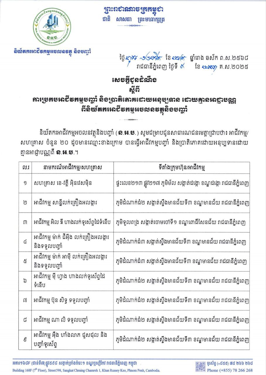 រាជធានីភ្នំពេញ៖ និយ័តករអាជីវកម្មអចលនវត្ថុ និងបញ្ចាំ ហៅកាត់ថា(ន.អ.ប.) បានជូនដំណឹងឱ្យសាធារណជនប្រុងប្រយ័ត្នចំពោះអាជីវកម្ម-សហគ្រាស លក់គ្រឿងអលង្ការ លក់ទូរសព្ទ និងទទួលបញ្ចាំចំនួន២០នៅរាជធានីភ្នំពេញ ក្រោយរកឃើញថាទីតាំងទាំងនោះគ្មានអាជ្ញាបណ្ណពីន.អ.ប.ឡើយ។ សេចក្តីជូនដំណឹងនេះ ចុះកាលបរិច្ឆេទតាំងពីថ្ងៃទី៩មេសា ឆ្នាំ២០២៥។