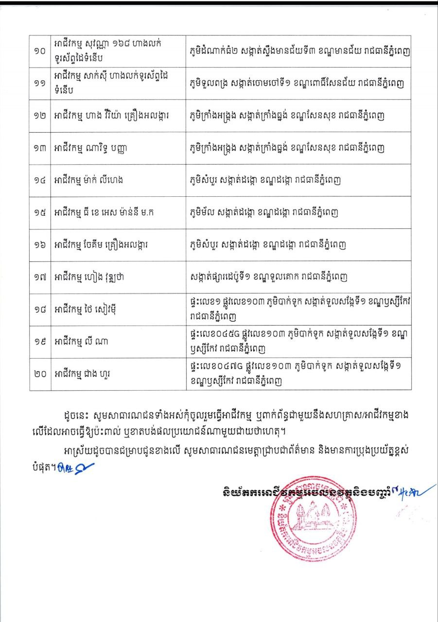 ទី១៤.អាជីវកម្ម ម៉ាក់ លីហេង នៅសង្កាត់ដង្កោ ខណ្ឌដង្កោ។ ទី១៥.អាជីវកម្ម ធី ខេ អេស ម៉ាន់នី នៅសង្កាត់ដង្កោ ខណ្ឌដង្កោ។ ទី១៦.អាជីវកម្ម ចែគីម គ្រឿងអលង្ការ នៅសង្កាត់ដង្កោ ខណ្ឌដង្កោ។ ទី១៧.អាជីវកម្ម ហៀង វុឌ្ឍថា នៅសង្កាត់ផ្សារដេប៉ូទី១ ខណ្ឌទួលគោក។ ទី១៨.អាជីវកម្ម ថៃ សៀវម៉ី នៅសង្កាត់ទួលសង្កែទី១ ខណ្ឌឫស្សីកែវ។ ទី១៩.អាជីវកម្ម លី ណា នៅសង្កាត់ទួលសង្កែទី១ ខណ្ឌឫស្សីកែវ។ ទី២០.អាជីវកម្ម ជាង ហួរ នៅសង្កាត់ទួលសង្កែទី១ ខណ្ឌឫស្សីកែវ៕