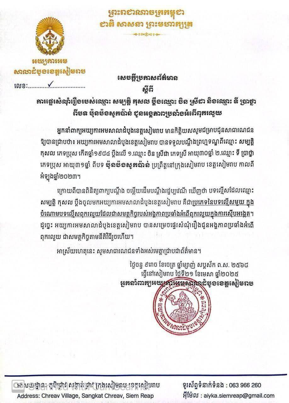 តាមរយៈសេចក្ដីប្រកាសព័ត៌មានរបស់តុលាការខេត្តសៀមរាប នៅថ្ងៃទី២១ ខែមេសា ឆ្នាំ២០២៥ បានបញ្ជាក់យ៉ាងដូច្នេះថា៖«អយ្យការអមសាលាដំបូងខេត្តសៀមរាប បានទទួលបណ្តឹងព្រហ្មទណ្ឌពីឈ្មោះ សម្បត្តិ កុសល ភេទប្រុស កើតឆ្នាំ១៩៨៤ ប្តឹងលើ ១.ឈ្មោះ ចិន ស្រីដា ភេទស្រី អាយុ៣០ឆ្នាំ, ២.ឈ្មោះ ទី ប្រាថ្នា ភេទប្រុស អាយុ៣១ឆ្នាំ ពីបទ ប៉ុនប៉ងសូកប៉ាន់ ប្រព្រឹត្តនៅក្រុងសៀមរាប ខេត្តសៀមរាប កាលពី អំឡុងឆ្នាំ២០២៣»។ យ៉ាងណា ក្រោយពីបានពិនិត្យពាក្យបណ្តឹង ចម្លើយដើមបណ្តឹងរដ្ឋប្បវេណី ឃើញថា បទល្មើសដែលឈ្មោះ សម្បត្តិ កុសល ប្ដឹងចូលមកអយ្យការអមសាលាដំបូងខេត្តសៀមរាប គឺជាប្រភេទនៃបទល្មើសមួយក្នុងចំណោមបទល្មើសពុករលួយ ដែលជាសមត្ថកិច្ចរបស់អង្គភាពប្រឆាំងអំពើពុករលួយក្នុងការស៊ើបអង្កេត។