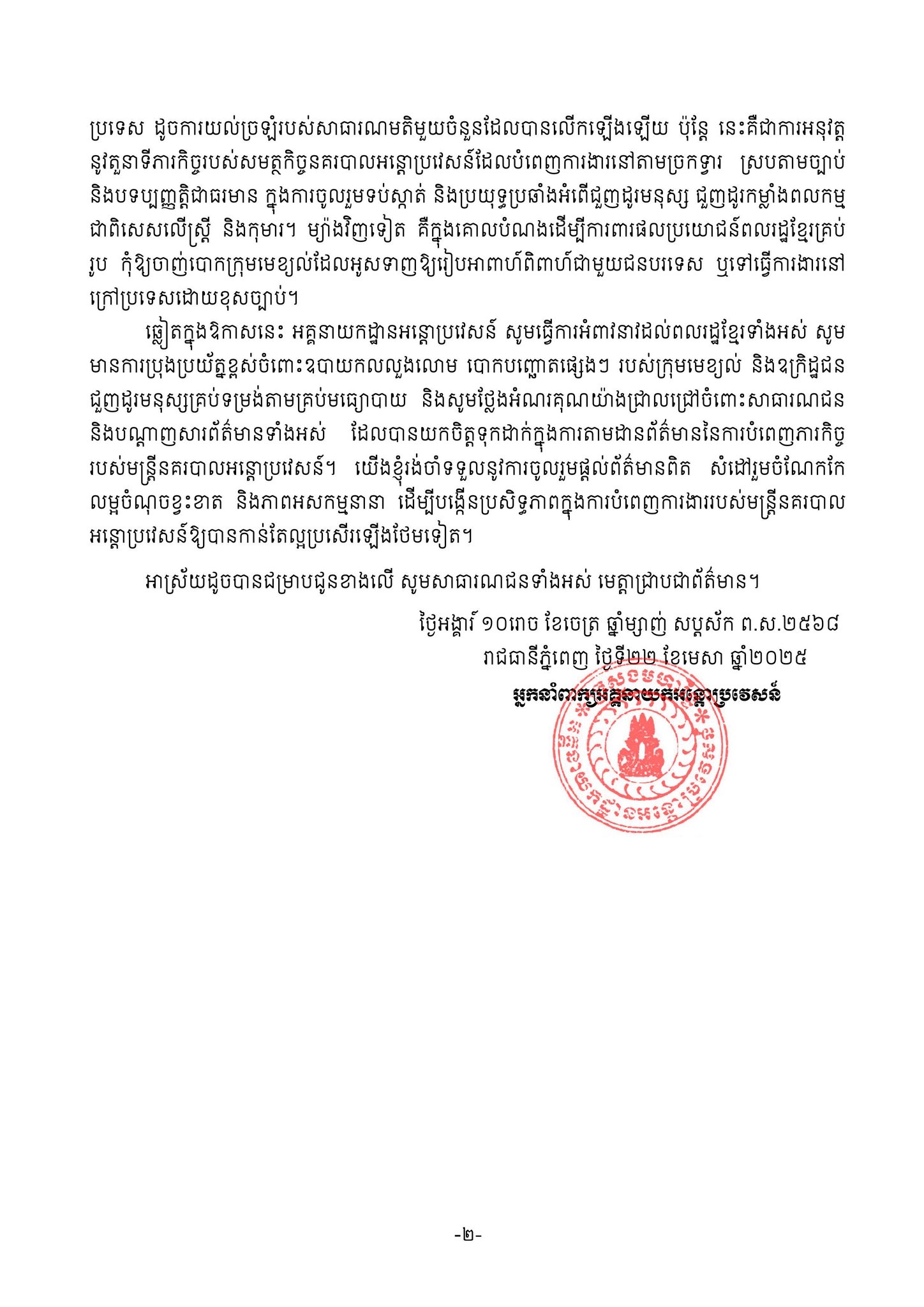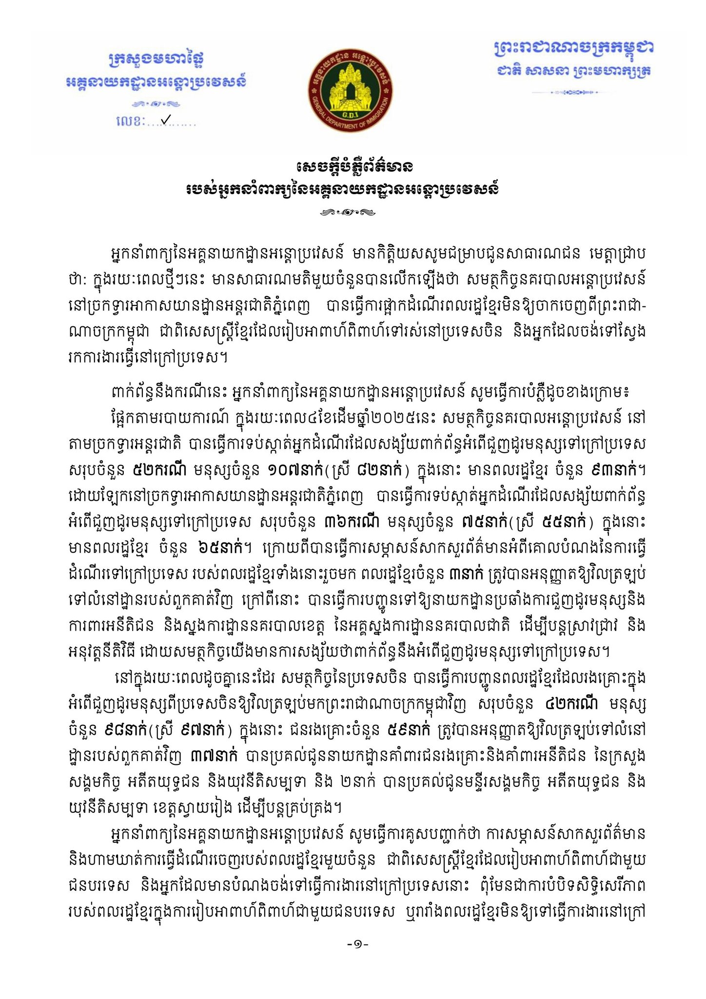 តាមរយៈសេចក្តីប្រកាសព័ត៌មានចេញផ្សាយនៅថ្ងៃដដែលនេះ អ្នកនាំពាក្យអគ្គនាយកដ្ឋានអន្តោប្រវេសន៍ គូសបញ្ជាក់ថា ក្នុងរយៈពេលថ្មីៗនេះ មានសាធារណមតិមួយចំនួនលើកឡើងថា សមត្ថកិច្ចនគរបាលអន្តោប្រវេសន៍នៅច្រកទ្វារអាកាសយានដ្ឋានអន្តរជាតិភ្នំពេញ បានធ្វើការផ្អាកដំណើរពលរដ្ឋខ្មែរមិនឱ្យចាកចេញពីព្រះរាជាណាចក្រកម្ពុជា ជាពិសេសស្ត្រីខ្មែរដែលរៀបអាពាហ៍ពិពាហ៍ទៅរស់នៅប្រទេសចិន និងអ្នកដែលចង់ទៅស្វែងរកការងារធ្វើនៅក្រៅប្រទេស។ ក្នុងន័យនេះ អ្នកនាំពាក្យ សូមធ្វើការពន្យល់ និងបំភ្លឺជូនសាធារណជនថា ក្នុងរយៈពេល(ជិត)៤ខែ ដើមឆ្នាំ២០២៥នេះ សមត្ថកិច្ចនៅតាមច្រកទ្វារអន្តរជាតិនានា បានធ្វើការទប់ស្កាត់អ្នកដំណើរដែលសង្ស័យពាក់ព័ន្ធអំពើជួញដូរមនុស្សទៅក្រៅប្រទេសសរុបចំនួន១០៧នាក់ (ស្រី៨២នាក់) ក្នុង៥២ករណី ក្នុងនោះមានពលរដ្ឋខ្មែរចំនួន៩៣នាក់។