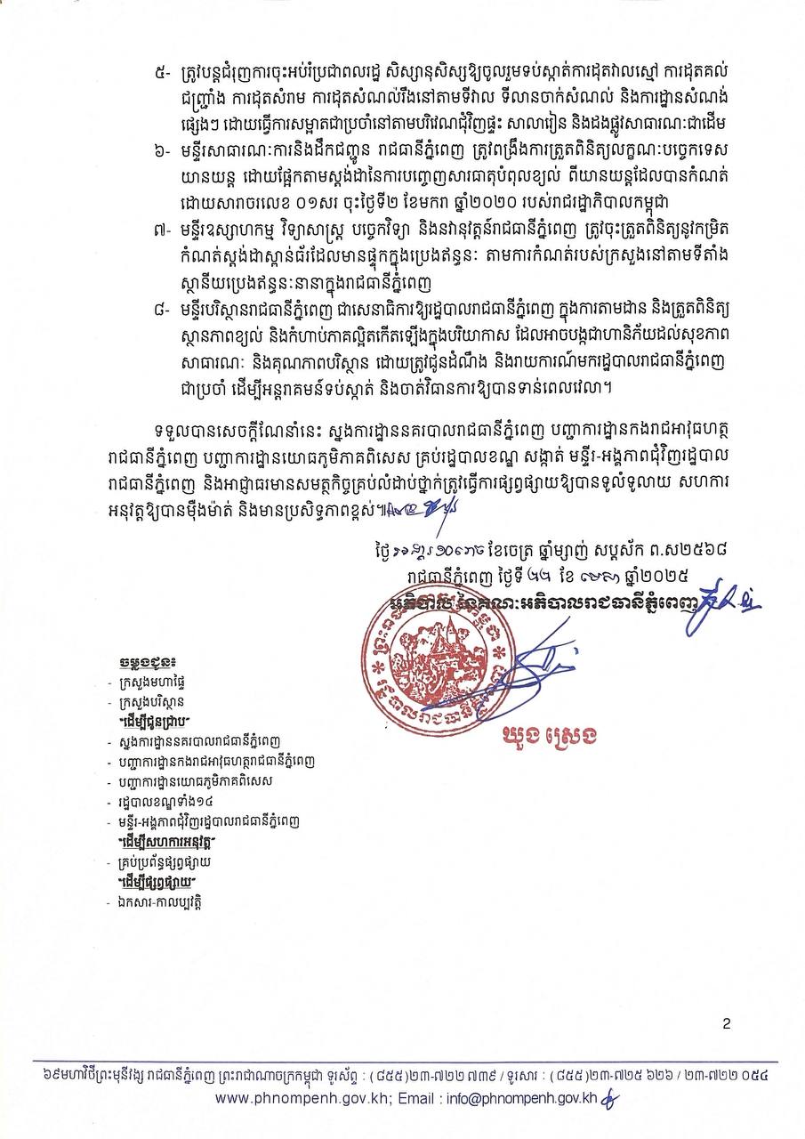 រដ្ឋបាលរាជធានីភ្នំពេញ គូសបញ្ជាក់យ៉ាងដូច្នេះថា ការក្រើនរំឭកនេះ ធ្វើទ្បើងដើម្បីទប់ស្កាត់ និងកាត់បន្ថយការបំពុលខ្យល់សាធារណៈនៅក្នុងភូមិសាស្ត្ររាជធានីភ្នំពេញ។ ដូចនេះ រដ្ឋបាលខណ្ឌ ក៏ដូចជាអ្នកពាក់ព័ន្ធ ត្រូវណែនាំដល់ម្ចាស់អាជីវកម្មគួររៀបចំគ្របគម្រប ឬចងតង់ឱ្យបានត្រឹមត្រូវ ដើម្បីចៀសវាងជ្រុះធ្លាក់តាមដងផ្លូវ។ មួយវិញទៀត បើម្ចាស់អាជីវកម្មទុកដាក់ខ្សាច់ ក្រួស ថ្ម កម្ទេចអគារ ។ល។ រំលោភលើចំណីផ្លូវសាធារណៈបង្កឱ្យមានគ្រោះថ្នាក់ដល់ការធ្វើដំណើរ និងបង្កឱ្យមានការហុយជះប៉ះលើអ្នករួមដំណើរ នឹងត្រូវអនុវត្តតាមវិធានការផ្លូវច្បាប់ដោយគ្មានការលើកលែងទ្បើយ។
