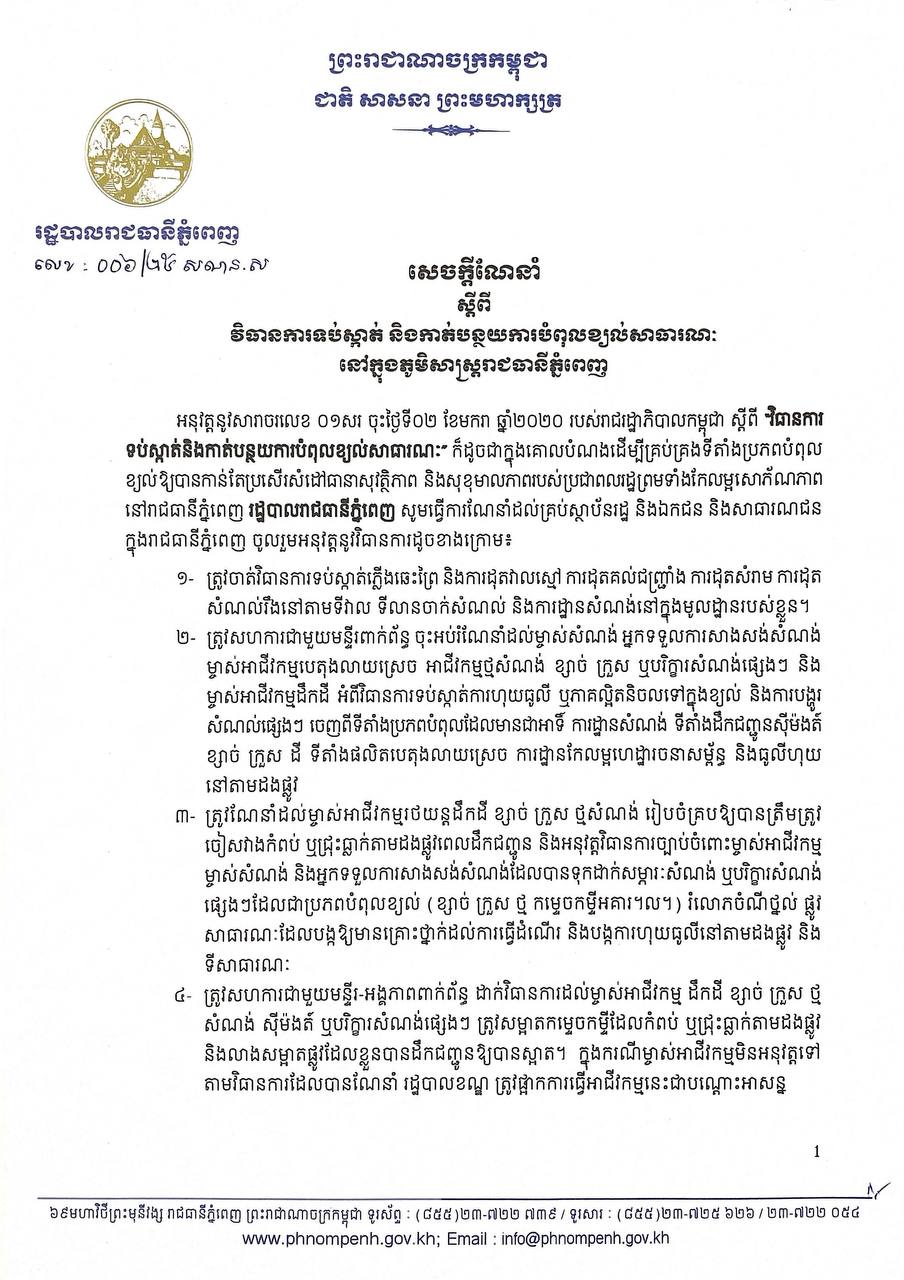 រាជធានីភ្នំពេញ៖ រដ្ឋបាលរាជធានីភ្នំពេញ កាលពីថ្ងៃទី២២មេសា បានដាស់តឿនដល់ម្ចាស់អាជីវកម្មដឹកដី ខ្សាច់ ក្រួស ថ្ម សំណង់ ស៊ីម៉ងត៍ ឬបរិក្ខារសំណង់ផ្សេងៗ បើមានជ្រុះធ្លាក់តាមដងផ្លូវត្រូវប្រមូលចេញ និងលាងសម្អាតផ្លូវឱ្យបានស្អាត។ ក្នុងករណីគឃ្លើនមិនអនុវត្តទៅតាមវិធានការដែលបានណែនាំ នឹងត្រូវផ្អាកអាជីវកម្មជាបណ្តោះអាសន្ន…។