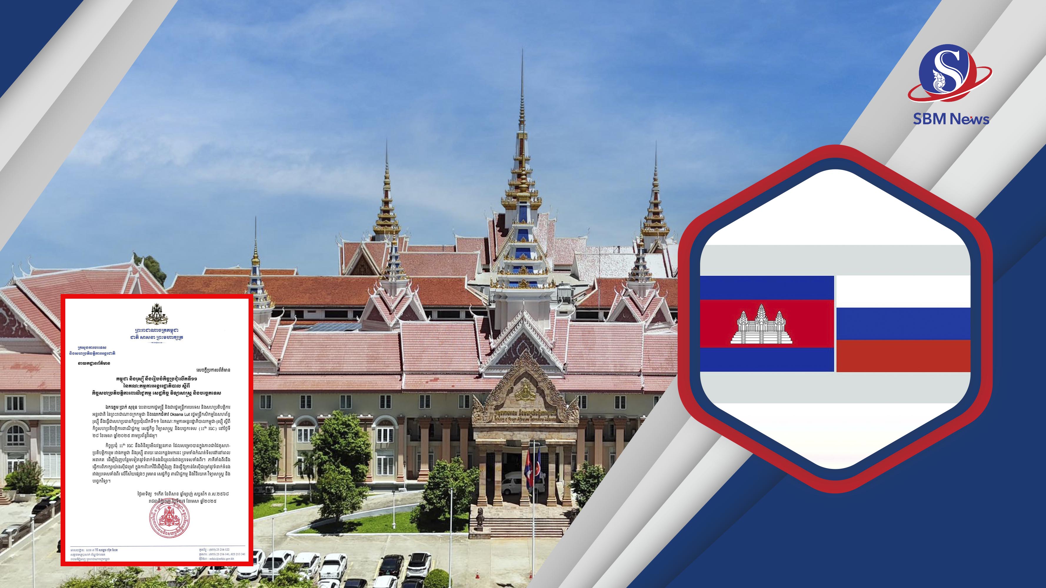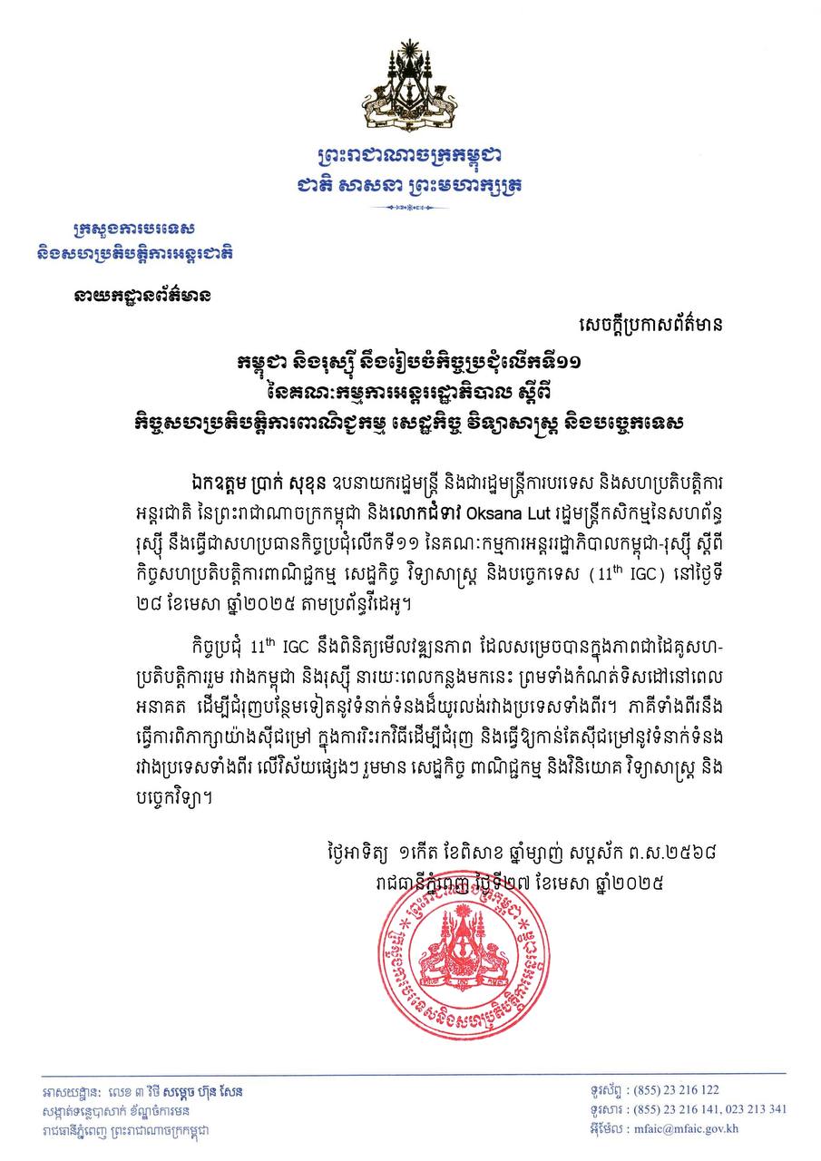 ក្រសួងការបរទេស និងសហប្រតិបត្តិការអន្តរជាតិ គូសបញ្ជាក់ថា កិច្ចប្រជុំធ្វើតាមប្រព័ន្ធវីដេអូនៅថ្ងៃទី២៨ ខែមេសា ឆ្នាំ២០២៥ស្អែកនេះ ដោយមានលោក ឧបនាយករដ្ឋមន្ត្រី ប្រាក់ សុខុន រដ្ឋមន្ត្រីការបរទេសកម្ពុជា និងលោកជំទាវអុកសានា លូត Оксана Лут រដ្ឋមន្ត្រីកសិកម្មនៃសហព័ន្ធរុស្ស៊ី នឹងធ្វើជាសហប្រធានកិច្ចប្រជុំលើកទី១១ នៃគណៈកម្មការអន្តររដ្ឋាភិបាលកម្ពុជា-រុស្ស៊ី ស្តីពីកិច្ចសហប្រតិបត្តិការពាណិជ្ជកម្ម សេដ្ឋកិច្ច វិទ្យាសាស្ត្រ និងបច្ចេកទេស ។ ក្រសួងបន្ថែមថា កិច្ចប្រជុំនេះ នឹងពិនិត្យមើលវឌ្ឍនភាពដែលសម្រេចបានក្នុងភាពជាដៃគូសហប្រតិបត្តិការ រួមរវាងកម្ពុជានិងរុស្ស៊ី នារយៈពេលកន្លងមក និងកំណត់ទិសដៅនៅពេលអនាគត ដើម្បីជំរុញបន្ថែមទៀតនូវទំនាក់ទំនងដ៏យូរលង់រវាងប្រទេសទាំងពីរផងដែរ៕
