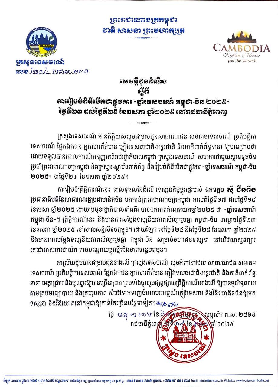 ក្រសួងបញ្ជាក់ថា ព្រឹត្តិការណ៍បើកជាផ្លូវការ «ឆ្នាំទេសចរណ៍ កម្ពុជា-ចិន ២០២៥» ត្រូវបានប្រមុខរាជ/រដ្ឋាភិបាលទាំងពីរឯកភាពគ្នា ក្នុងដំណើរទស្សនកិច្ចផ្លូវរដ្ឋរបស់លោក ស៊ី ជីនពីង ប្រធានាធិបតី នៃសាធារណរដ្ឋប្រជាមានិតចិន មកកាន់កម្ពុជាកាលពីខែមេសា។ ចំពោះការរៀបចំកម្មវិធី នឹងមានការសម្ដែងទស្សនីយភាពសិល្បៈរួមគ្នា កម្ពុជា-ចិន នាល្ងាចថ្ងៃទី២៣ឧសភា នៅសាលសន្និសីទចតុម្មុខ។ ដោយឡែក នៅថ្ងៃទី២៤ និងថ្ងៃទី២៥ ខែឧសភា ឆ្នាំ២០២៥ នឹងមានការសម្ដែងទស្សនីយភាពសិល្បៈរួមគ្នា កម្ពុជា-ចិន សម្រាប់មហាជនទស្សនា នៅបរិវេណសួនច្បារតេជោមាសតេជោយ៉ត តាមបណ្តោយផ្លូវថ្មើរជើងមាត់ទន្លេចតុម្មុខ។