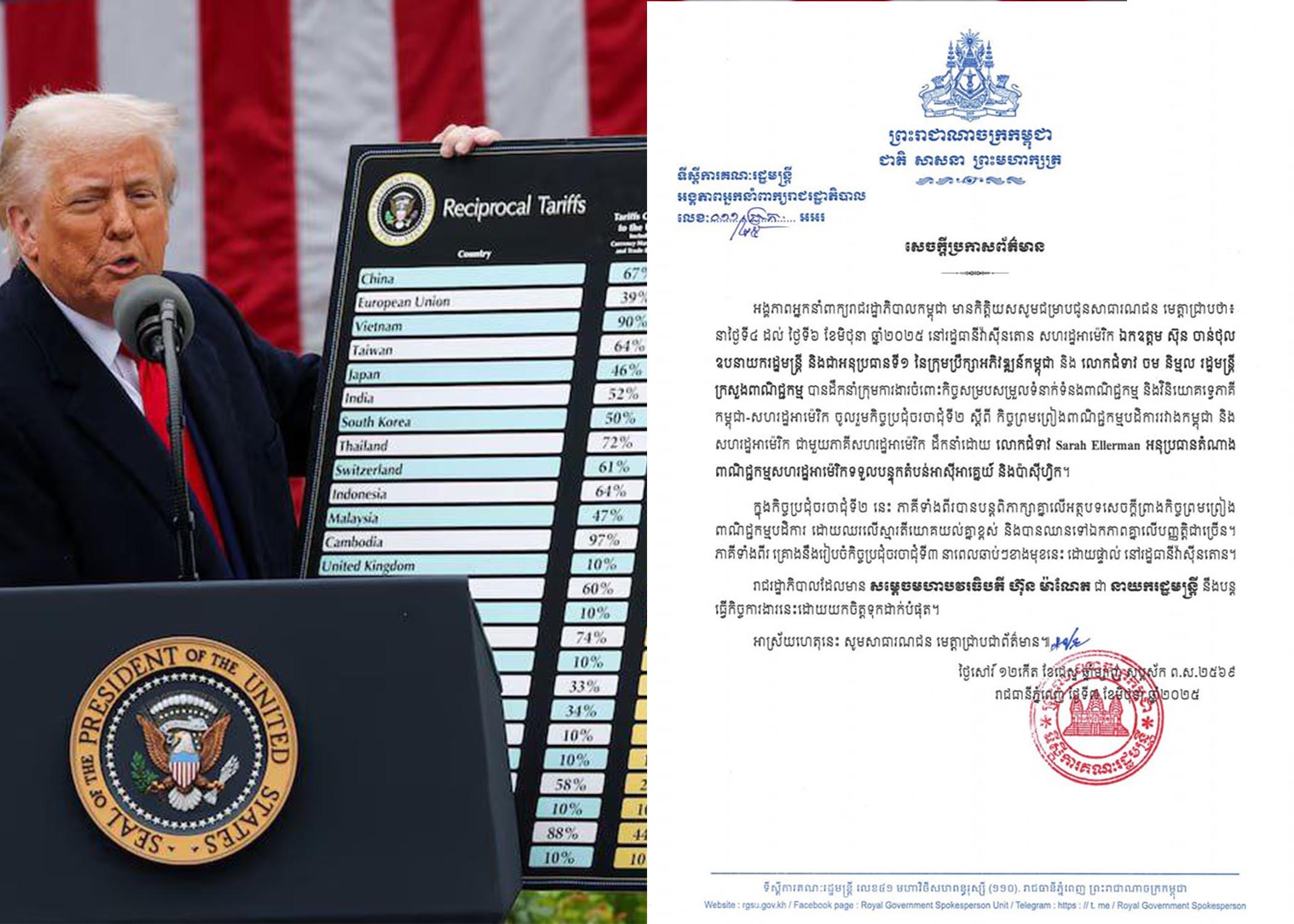 សូមរំឭកថា កាលពីដើមខែមេសាកន្លងទៅ លោក ដូណាល់ ត្រាំ ប្រធានាធិបតីអាម៉េរិក បានប្រកាសពីការដំទ្បើងពន្ធការនាំចូលប្រទេសអាម៉េរិក ដោយយកពីកម្ពុជា៤៩ភាគរយ ប៉ុន្តែប្រហែលមួយសប្តាហ៍ក្រោយមក លោក ដូណាល់ ត្រាំ ប្តូរចិត្តវិញ ដោយប្រកាសបន្ថយពន្ធជូនគ្រប់ប្រទេសលើពិភពលោក នៅត្រឹម១០ភាគរយស្មើៗគ្នា រួមទាំងកម្ពុជាផងដែរ គឺលើកលែងតែចិន១ប៉ុណ្ណោះ និងទុករយៈពេល៩០ថ្ងៃដើម្បីចរចាពន្ធបដិការឡើងវិញ។ កម្ពុជាត្រូវបង់ពន្ធត្រឹម១០ភាគរយ ពេលនាំទំនិញចូលទៅអាម៉េរិក។ ១០ភាគរយនេះ គឺក្នុងរយៈពេល៩០ថ្ងៃប៉ុណ្ណោះ មិនមែនអចិន្ត្រៃយ៍ឡើយ។ ខណៈរយៈពេល៩០ថ្ងៃ គឺជាឱកាសដែលសហរដ្ឋអាម៉េរិកផ្តល់ឱ្យប្រទេសនានាលើពិភពលោកមកចរចាជាមួយ។ ៩០ថ្ងៃក្រោយនៃឱសានវាទ រដ្ឋាភិបាលអាម៉េរិកអាចនឹងធ្វើសេចក្តីសម្រេចផ្សេងទៀត។ សូមជម្រាបថា កម្ពុជាបានចេញទៅចរចាជាមួយអាម៉េរិក លើកទី១ នៅរដ្ឋធានីវ៉ាស៊ីនតោន ពីថ្ងៃទី១៤ដល់១៥ឧសភា ឆ្នាំ២០២៥ និងលើកទី២ ទើបតែទៅថ្មីៗនេះដែរ ពោលគឺចាប់ពីថ្ងៃទី៤-៦ ខែមិថុនា ឆ្នាំ២០២៥៕