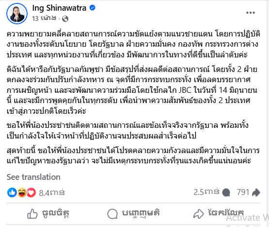 លោកស្រីបន្តថា ដើម្បីកាត់បន្ថយការប្រឈមមុខដាក់គ្នា និងការតភ្ជាប់កិច្ចសហប្រតិបត្តិការដោយប្រើយន្តការ (JBC) នាថ្ងៃទី១៤ ខែមិថុនាខាងមុខ យើងបានជំរុញឱ្យមានកិច្ចពិភាក្សាគ្រប់កម្រិតទាំងអស់ ដើម្បីធ្វើឱ្យទំនាក់ទំនងនៃប្រទេសទាំងពីរមានប្រក្រតីភាពឡើងវិញឱ្យបានឆាប់រហ័សបំផុត។ ជាមួយគ្នា យើងក៏សូមស្នើឱ្យប្រជាពលរដ្ឋតាមដានស្ថានការណ៍ និងការផ្ដល់ព័ត៌មានពិតពីរាជរដ្ឋាភិបាល និងផ្តល់ការលើកទឹកចិត្តដល់យើងឱ្យបន្តការងាររហូតទទួលបានជោគជ័យ។ «ជាចុងក្រោយ ខ្ញុំសូមសំណូមពរដល់បងប្អូនជនរួមជាតិ មេត្តារំសាយការព្រួយបារម្ភ និងជឿជាក់មកលើដំណោះស្រាយរបស់រាជរដ្ឋាភិបាល ចំពោះបញ្ហានេះ។ ហើយយើងប្រាកដជានឹងមិនឱ្យមានឧប្បត្តិហេតុណាមួយកើតឡើងធ្ងន់ធ្ងរនោះឡើយ។» នេះជាការបញ្ជាក់របស់លោកស្រីនាយករដ្ឋមន្ត្រីថៃ ផែថងថាន ឈិនៈវ័ត។