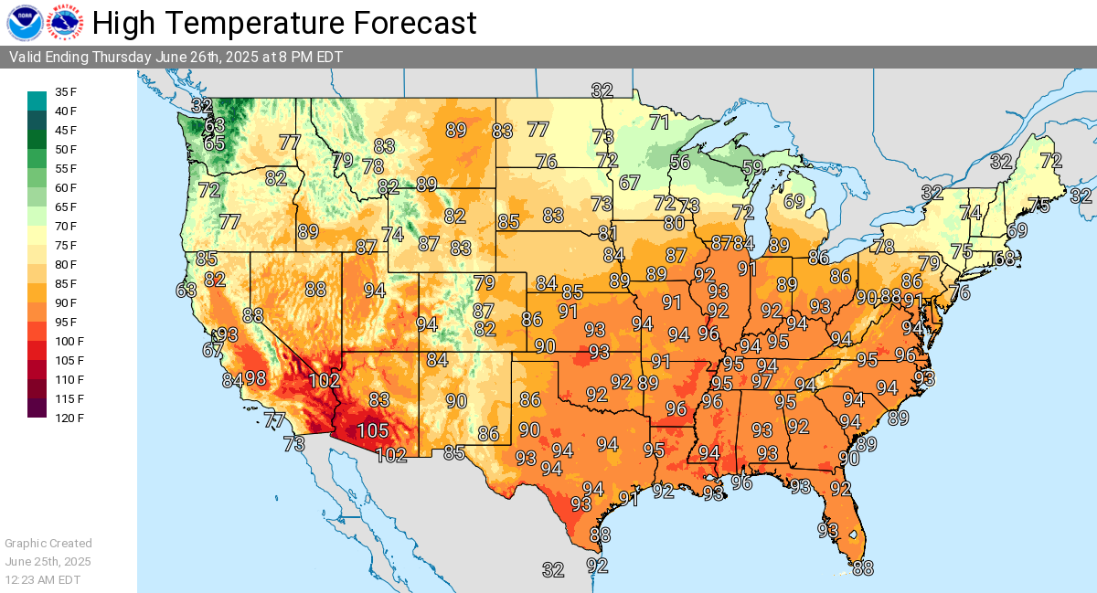 យោងតាមសេវាអាកាសធាតុជាតិ សីតុណ្ហភាពនៅរដ្ឋធានីវ៉ាស៊ីនតោន និងទីក្រុងបូស្តុន ត្រូវបានគេរំពឹងថា នឹងកើនឡើងដល់៣៨អង្សាសេ ដោយបំបែកកំណត់ត្រាពីមុនរហូតដល់៦អង្សាសេ។ នៅ Central Park នៃទីក្រុងញូវយ៉ក សីតុណ្ហភាពអាចឡើងដល់៣៧អង្សាសេ ហើយរលកកម្តៅត្រូវបានរំពឹងថា នឹងគ្របដណ្ដប់លើផ្នែកផ្សេងទៀតនៃភាគខាងកើតសហរដ្ឋអាម៉េរិក រួមទាំងភាគខាងជើង Georgia, the Carolinas, Virginia, Maryland និង Pennsylvania។