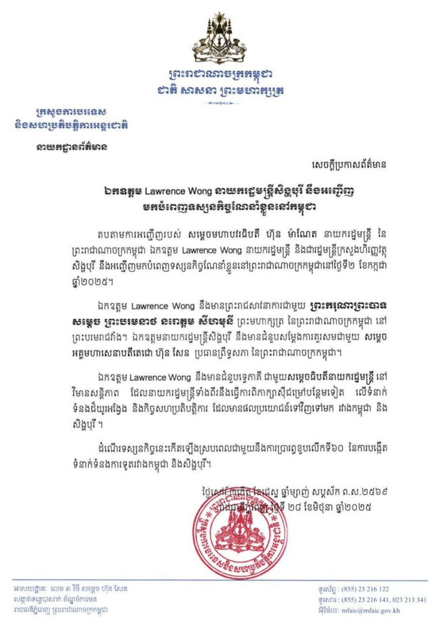 រាជធានីភ្នំពេញ៖ លោក ឡរ៉េន វ៉ុង (Lawrence Wong) នាយករដ្ឋមន្ត្រីសិង្ហបុរី និងជារដ្ឋមន្ត្រីកាន់ក្រសួងហិរញ្ញវត្ថុដោយខ្លួនឯង នឹងអញ្ជើញមកបំពេញទស្សនកិច្ចនៅកម្ពុជាជាលើកដំបូង នៅថ្ងៃទី២ ខែកក្កដា ឆ្នាំ២០២៥។ គម្រោងបំពេញទស្សនកិច្ចរបស់នាយករដ្ឋមន្ត្រីសិង្ហបុរី គឺធ្វើឡើងតបតាមការអញ្ជើញរបស់មេដឹកនាំកម្ពុជា សម្តេចនាយករដ្ឋមន្រ្តី ហ៊ុន ម៉ាណែត។