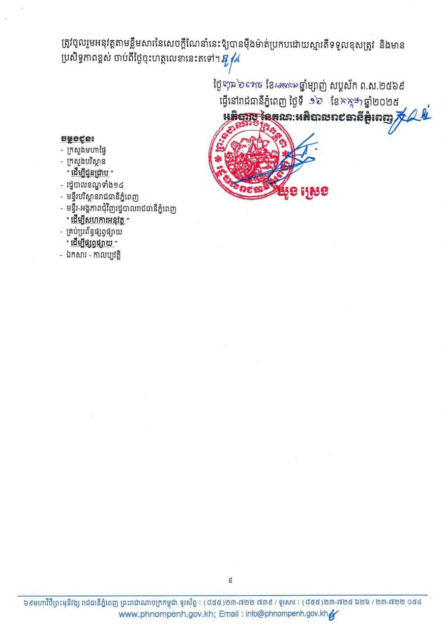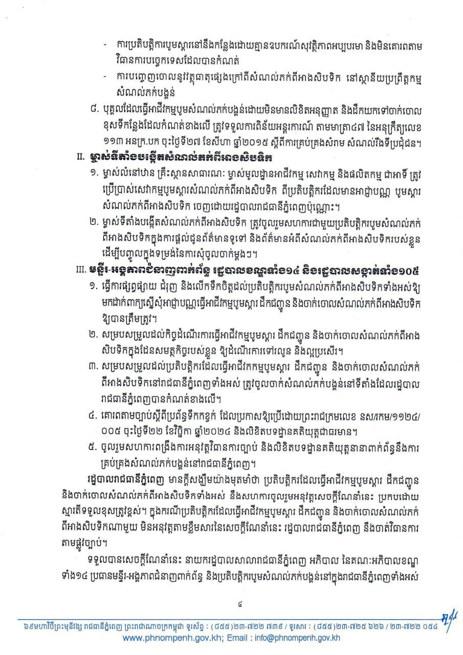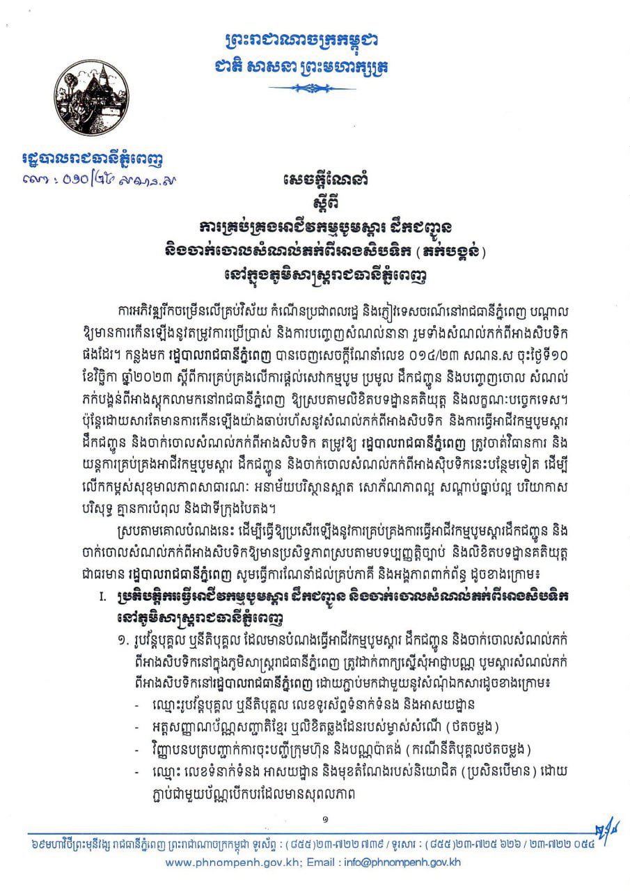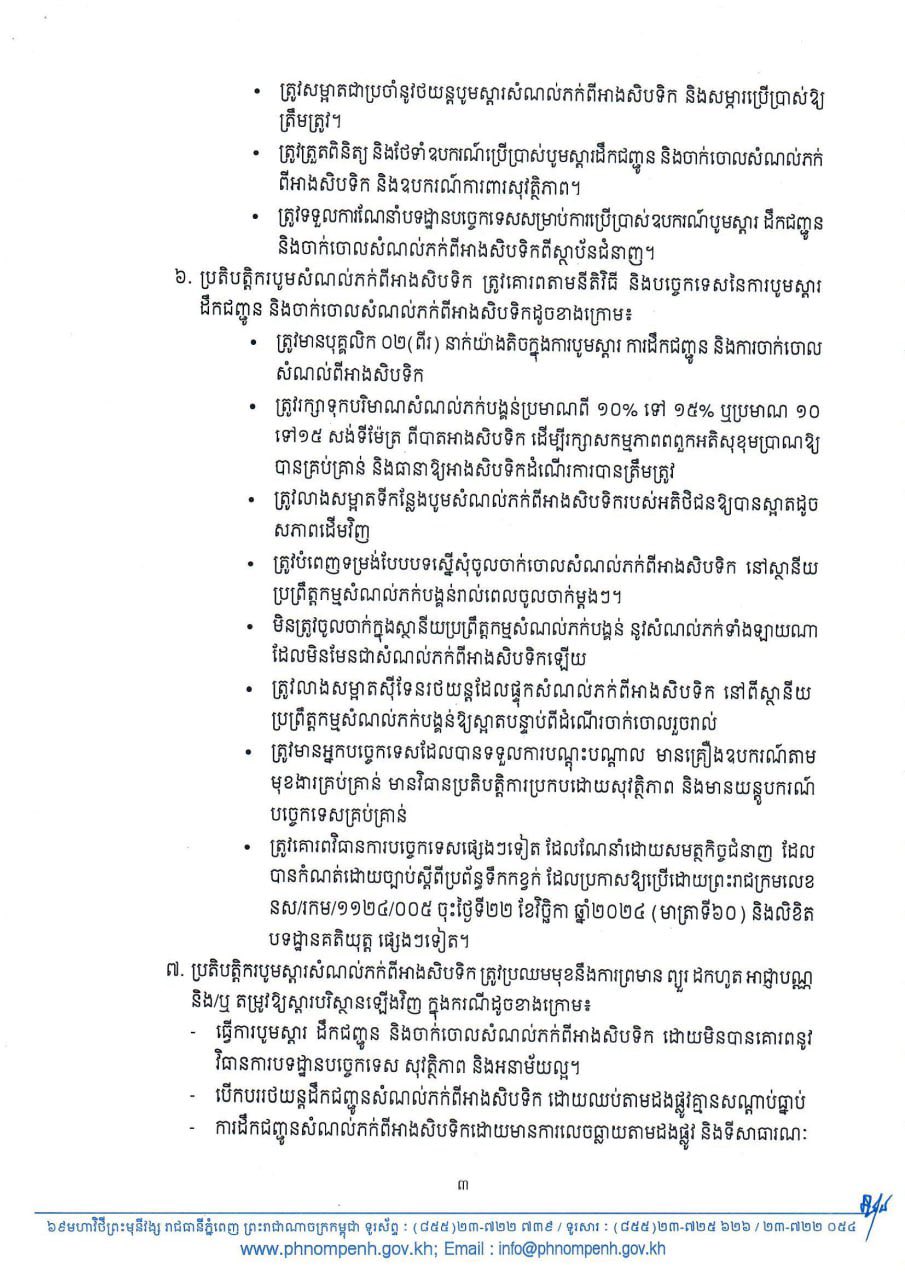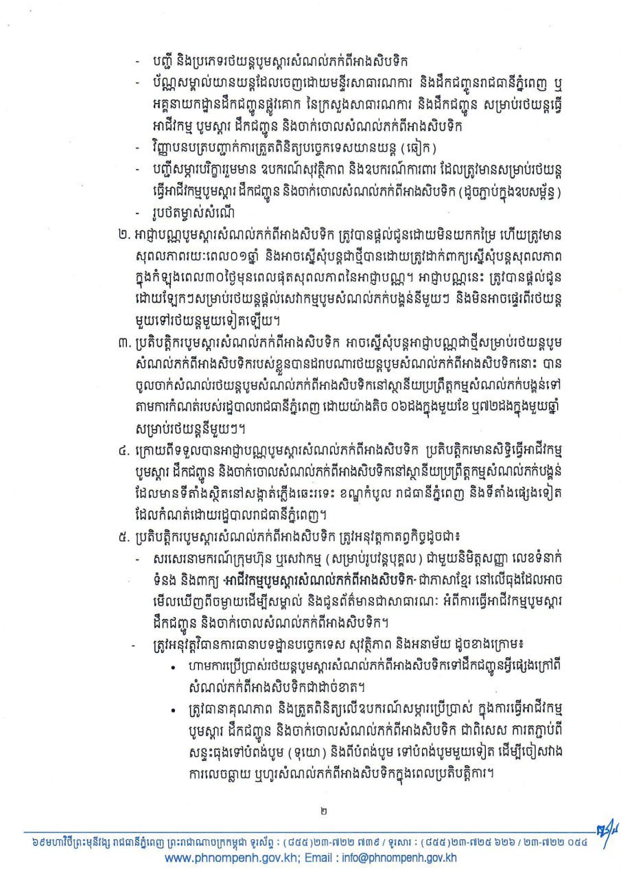 រាជធានីភ្នំពេញ៖ រដ្ឋបាលរាជធានីភ្នំពេញ នៅថ្ងៃទី១៨កក្កដានេះ បានណែនាំដល់គ្រប់ភាគីពាក់ព័ន្ធ ពិសេសបុគ្គលធ្វើអាជីវកម្មបូមស្តារ ដឹកជញ្ជូន និងចាក់ចោលសំណល់ភក់ពីអាងសិបទិក(ភក់បង្គន់) ត្រូវទៅដាក់ពាក្យស្នើសុំអាជ្ញាបណ្ណមុនធ្វើប្រតិបត្តិការ។ ការប្រកាសនេះ ធ្វើឡើងបន្ទាប់ពីការបញ្ចេញសំណល់ភក់បង្គន់មានការកើនឡើងយ៉ាងឆាប់រហ័ស ក្នុងភូមិសាស្ត្ររាជធានីភ្នំពេញ...។
