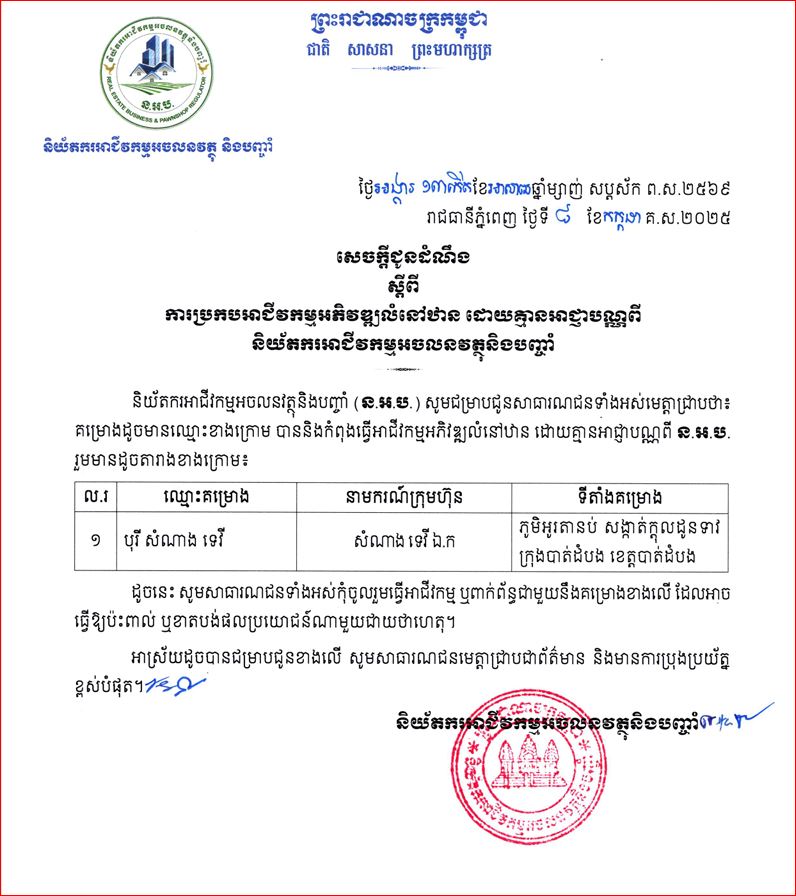 គម្រោងទាំង៣នោះ រួមមាន៖ ទី១. គម្រោង បុរី សំណាង របស់ក្រុមហ៊ុន សំណាងទេវី មានទីតាំងនៅភូមិអូរតានប់ សង្កាត់ក្តុលដូនទាវ ក្រុងបាត់ដំបង ខេត្តបាត់ដំបង ទី២. គម្រោង ផ្ទះល្វែងសិរីសម្បត្តិ កំពុងធ្វើអាជីវកម្មនៅ ភូមិវិមានទ្រង់ សង្កាត់ក្រាំងធ្នង់ ខណ្ឌសែនសុខ រាជធានីភ្នំពេញ ទី៣. គម្រោង លំនៅឋានត្យា ស្ថិតនៅភូមិស្វាយឧត្តម សង្កាត់ពន្សាំង ខណ្ឌព្រែកព្នៅ រាជធានីភ្នំពេញ។ និយ័តករអាជីវកម្មអចលនវត្ថុនិងបញ្ចាំ ថែមទាំងព្រមមានថា សាធារណជនទាំងអស់ អាចនឹងខាតបង់ផលប្រយោជន៍ណាមួយជាយថាហេតុ ក្នុងករណីចូលរួមធ្វើអាជីវកម្ម ឬពាក់ព័ន្ធជាមួយនឹងគម្រោងទាំង៣ខាងលើននេះ៕