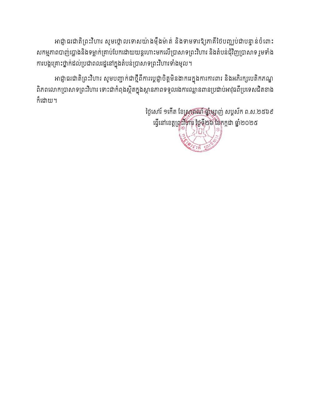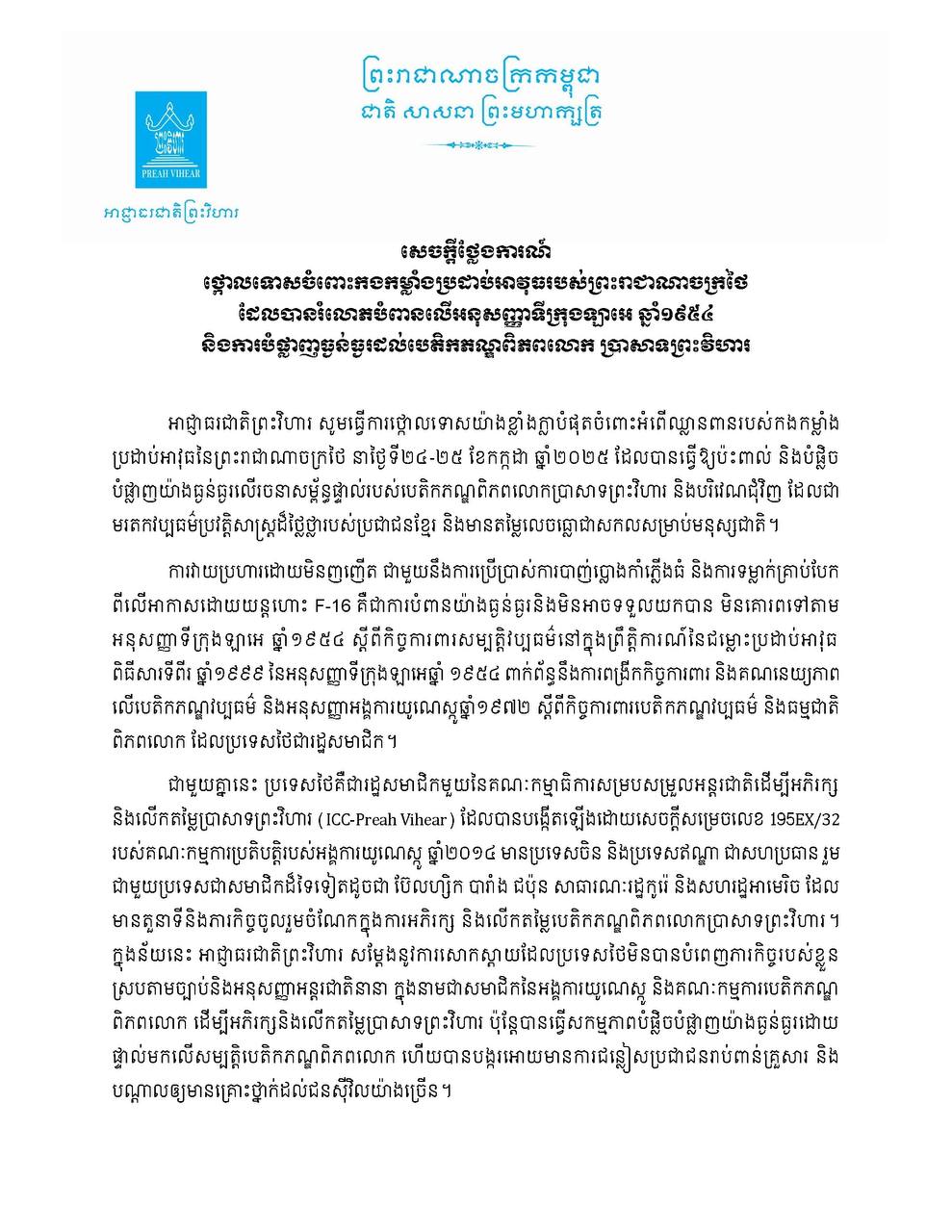 តារយៈសេចក្តីថ្លែងការនៅព្រឹកថ្ងៃទី២៦កក្កដានេះ អាជ្ញាធរជាតិព្រះវិហារ បានថ្កោលទោសយ៉ាងខ្លាំងក្លាបំផុត ចំពោះអំពើឈ្លានពានរបស់កងកម្លាំងប្រដាប់អាវុធថៃមកលើកម្ពុជា ចាប់តាំងតែពីថ្ងៃទី២៤ និង២៥កក្កដាមក។ ទង្វើឈ្លានពានរបស់ថៃបានធ្វើឱ្យប៉ះពាល់ និងបំផ្លិចបំផ្លាញយ៉ាងធ្ងន់ធ្ងរលើរចនាសម្ព័ន្ធផ្ទាល់របស់បេតិកភណ្ឌពិភពលោកប្រាសាទព្រះវិហារ និងបរិវេណជុំវិញ ដែលជាមរតកវប្បធម៌ប្រវត្តិសាស្ត្រដ៏ថ្លៃថ្លារបស់ប្រជាជនខ្មែរ និងមានតម្លៃលេចធ្លោជាសកលសម្រាប់មនុស្សជាតិ។ ក្នុងន័យនេះអាជ្ញាធរជាតិព្រះវិហារ៖«ថ្កោលទោសយ៉ាងម៉ឺងម៉ាត់ និងទាមទារឱ្យភាគីថៃបញ្ឈប់ជាបន្ទាន់ចំពោះ សកម្មភាពបាញ់ផ្លោង និងទម្លាក់គ្រាប់បែកដោយយន្តហោះមកលើប្រាសាទព្រះវិហារ និងតំបន់ជុំវិញប្រាសាទ រួមទាំងការបង្កគ្រោះថ្នាក់ដល់ប្រជាពលរដ្ឋនៅក្នុងតំបន់ប្រាសាទព្រះវិហារទាំងមូល»។