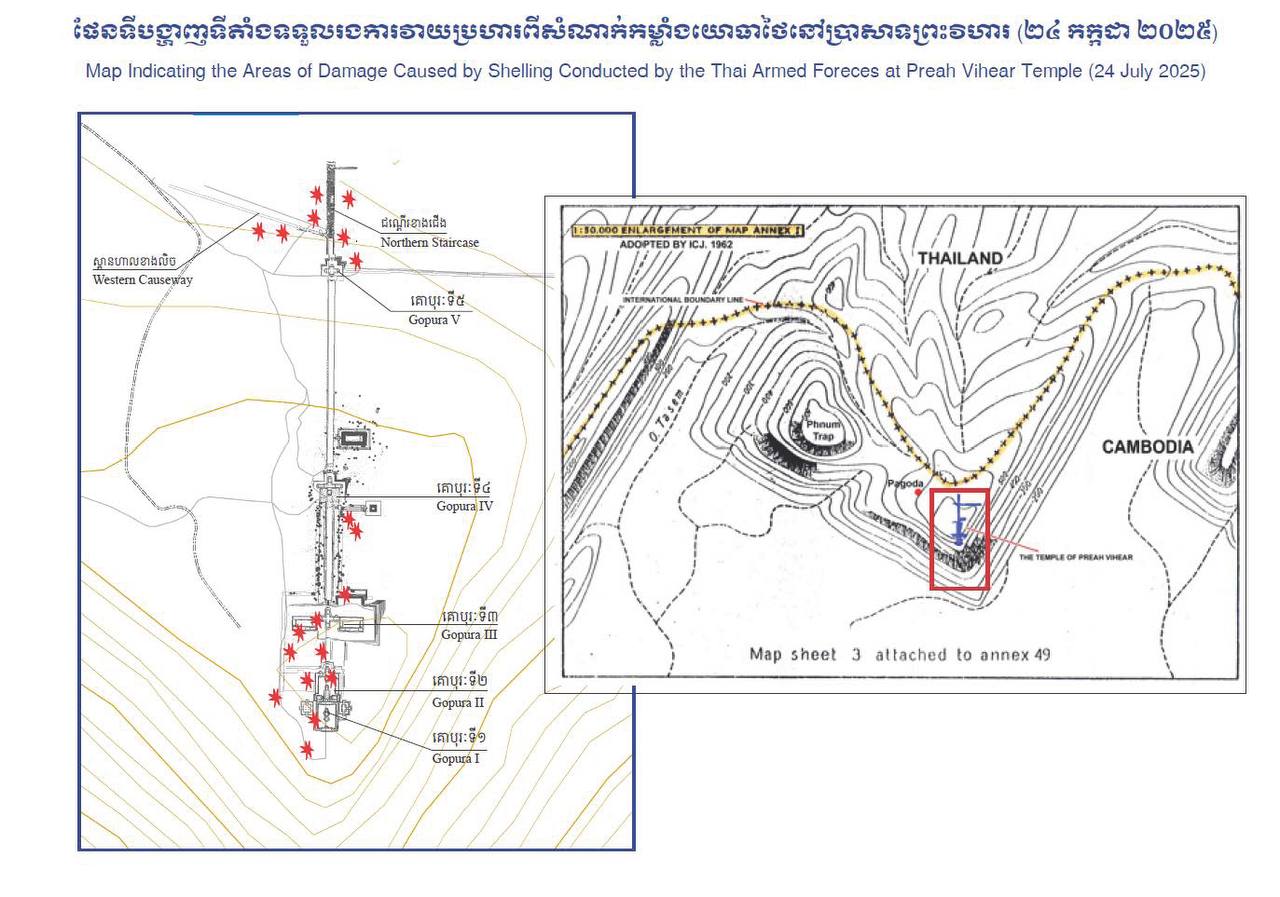 គួរជម្រាបថា ថៃបានបាញ់ផ្លោងកាំភ្លើងធំ និងការទម្លាក់គ្រាប់បែកពីលើអាកាសដោយយន្តហោះ F-16 មកលើកម្ពុជាគ្មានមិនញញើតច្បាប់អន្តរជាតិ ជាពិសេសទីតាំងបេតិកភណ្ឌពិភពលោក ប្រាសាទព្រះវិហារ ផ្ទាល់តែម្ដង។ ទង្វើរបស់ថៃននាពេលនេះគឺជាការបំពានយ៉ាងធ្ងន់ធ្ងរ និងមិនអាចទទួលយកបាន មិនគោរពទៅតាមអនុសញ្ញាទីក្រុងឡាអេ ឆ្នាំ១៩៥៤ ស្តីពីកិច្ចការពារសម្បត្តិវប្បធម៌នៅក្នុងព្រឹត្តិការណ៍នៃជម្លោះប្រដាប់អាវុធ ពិធីសារទីពីរឆ្នាំ១៩៩៩ នៃអនុសញ្ញាទីក្រុងឡាអេ ឆ្នាំ១៩៥៤ ពាក់ព័ន្ធនឹងការពង្រីកកិច្ចការពារ និងគណនេយ្យភាពលើបេតិកភណ្ឌវប្បធម៌ និងអនុសញ្ញាអង្គការយូណេស្កូ ឆ្នាំ១៩៧២ ស្តីពីកិច្ចការពារបេតិកភណ្ឌវប្បធម៌ និងធម្មជាតិពិភពលោក ដែលប្រទេសថៃជារដ្ឋសមាជិក៕